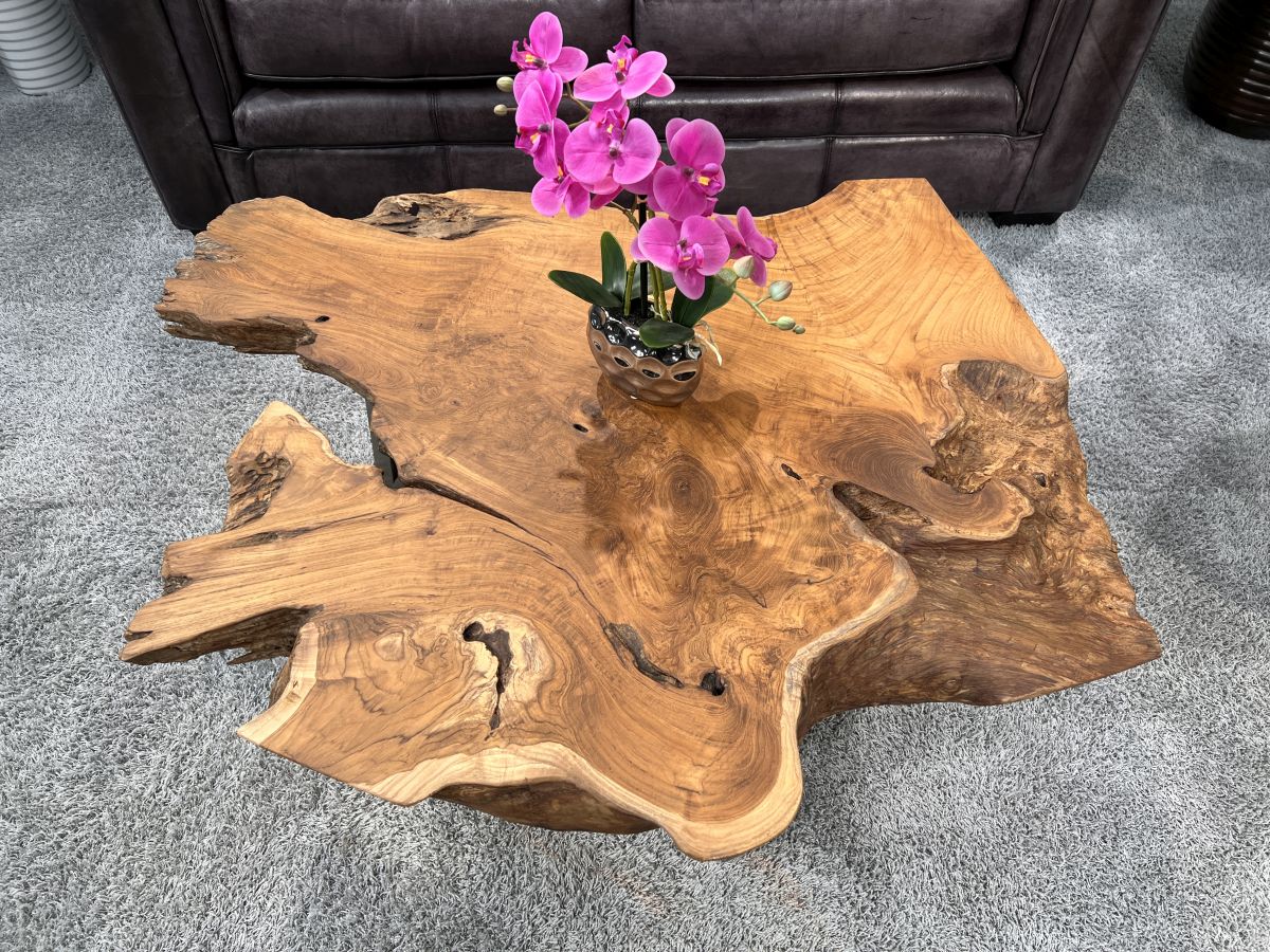 Modellbeispiel: Couchtisch „Bromo Teak“ Format: ca. 95 x 60-85 x 40 cm, Stärke der Tischplatte ca. 6 cm. Material: Teakholz (Wurzelholz Teak) und einem Tischgestell aus Edelstahl