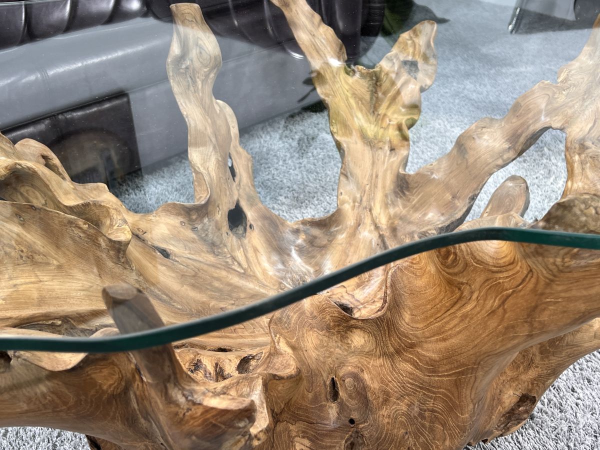 Modellbeispiel: Couchtisch Baumwurzel „Leaf“ Format: ca. 118 x 70-90 x 46 cm Materialien: Baumwurzel aus Suar (ähnl. Akazie) mit aufliegender Glasplatte