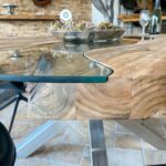 Die runde Tischplatte besteht aus einer Kombination verleimter Massivholzbohlen (recyceltes Teakholz) mit künstlerisch gestalteten Glaseinlegern. Die runde Tischplatte steht auf einem in Handarbeit gefertigtem Tischgestell aus gebürstetem Edelstahl in Kreuzform.