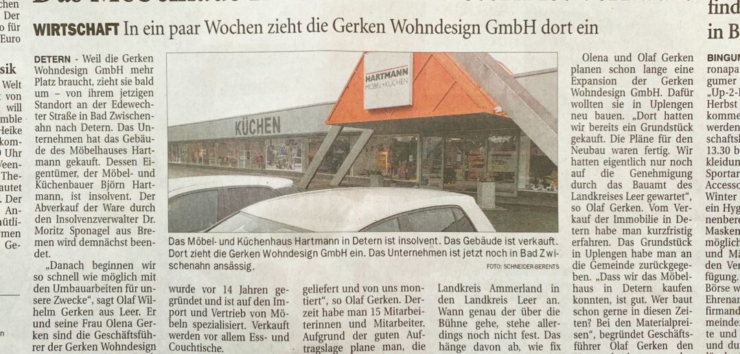 Ja, wir sind es, die das insolvente Möbelhaus Hartmann in Detern gekauft haben. In den kommenden zwei Wochen wird der Insolvenzverkäufer das Gebäude vollständig räumen und wir werden mit der Neugestaltung im Innen- und Außenbereich beginnen. Wir hoffen, dass wir kurzfristig unseren Standort der GERKEN Wohndesign GmbH von Bad Zwischenahn in die neue Ausstellung mit dem angeschlossenen Importlager auf einer Gesamtfläche von über 6000 qm verlegen können.