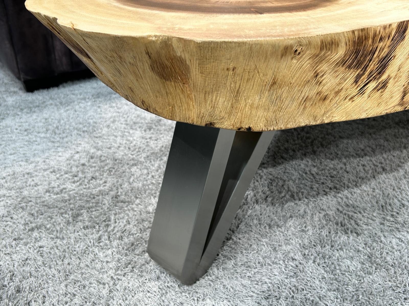 Modell: Couchtisch „Lakeside Suar“, massive Baumscheibe mit getöntem Glaseinleger und Tischgestell aus Edelstahl