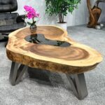 Der „Lakeside Suar“ ist einzigartiger Couchtisch aus einer Baumscheibe. Bei dieser Tischplatte aus einem Baumstamm kam das Holz des Suar zum Einsatz. Suar ist der Akazie sehr ähnlich und wird daher auch häufig unter diesem Handelsnamen angeboten. Die Baumscheibe aus einem Baumstamm wurde in reiner Handarbeit gesägt, geschliffen und lackiert. Der ursprüngliche Baumstamm war bereits im Innenbereich auf natürliche Weise verwachsen und erhielt aus diesem Grund eine interessante Verzierung mit einer getönten Glasplatte, welche diese Tischplatte zu einer außergewöhnlichen Besonderheit macht.