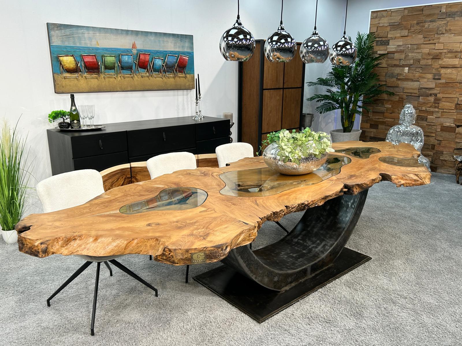 Material: Massive verleimte Baumscheiben aus dem Baumstumpf eines alten Teakbaumes mit einem XXL-Tischgestell aus Rohstahl und dekorativen Glaseinlagen