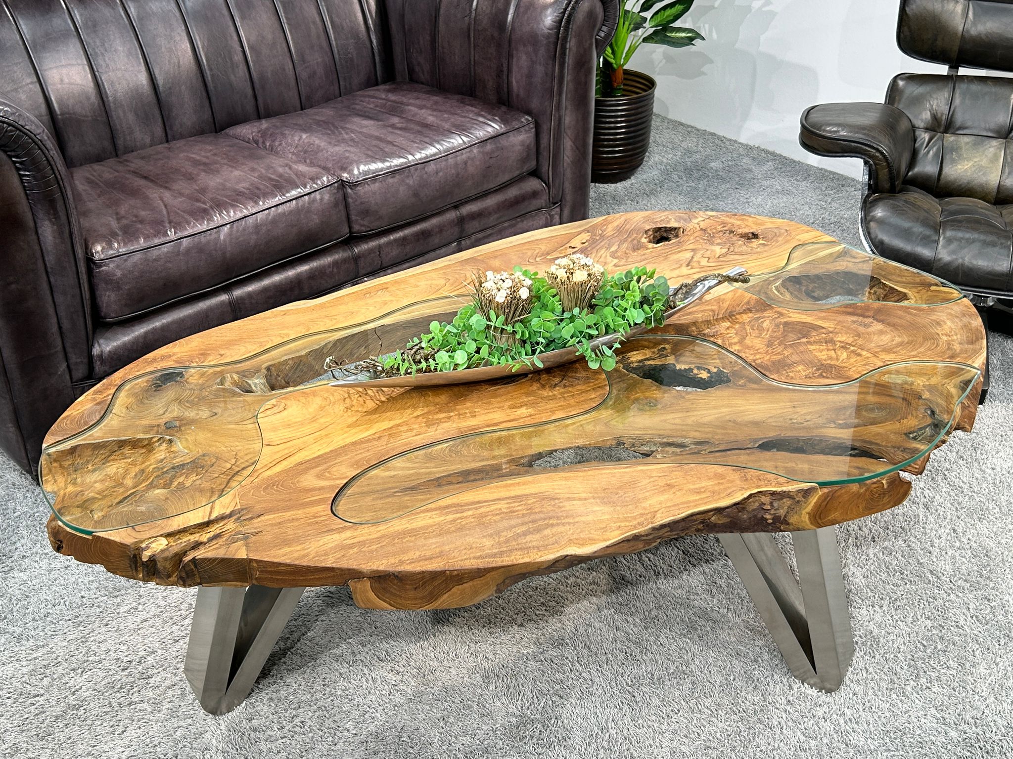 Die Tischplatte wurde aus verleimten Baumscheiben alter Teakbaumstümpfe gefertigt und hat eine massive Stärke von 8 cm. Das Holz stammt aus dem Bereich der Baumwurzel, wo durch jahrzehntelange Verwitterung und natürliche Prozesse einzigartige Verwachsungen und Löcher entstanden sind. Diese natürlichen Merkmale wurden in aufwendiger Handarbeit mit Glasplatten verziert, die einen faszinierenden Blick auf die Ursprünglichkeit und Struktur des Holzes ermöglichen. Im Anschluss an die Verleimung wurde die Tischplatte oval geschnitten.