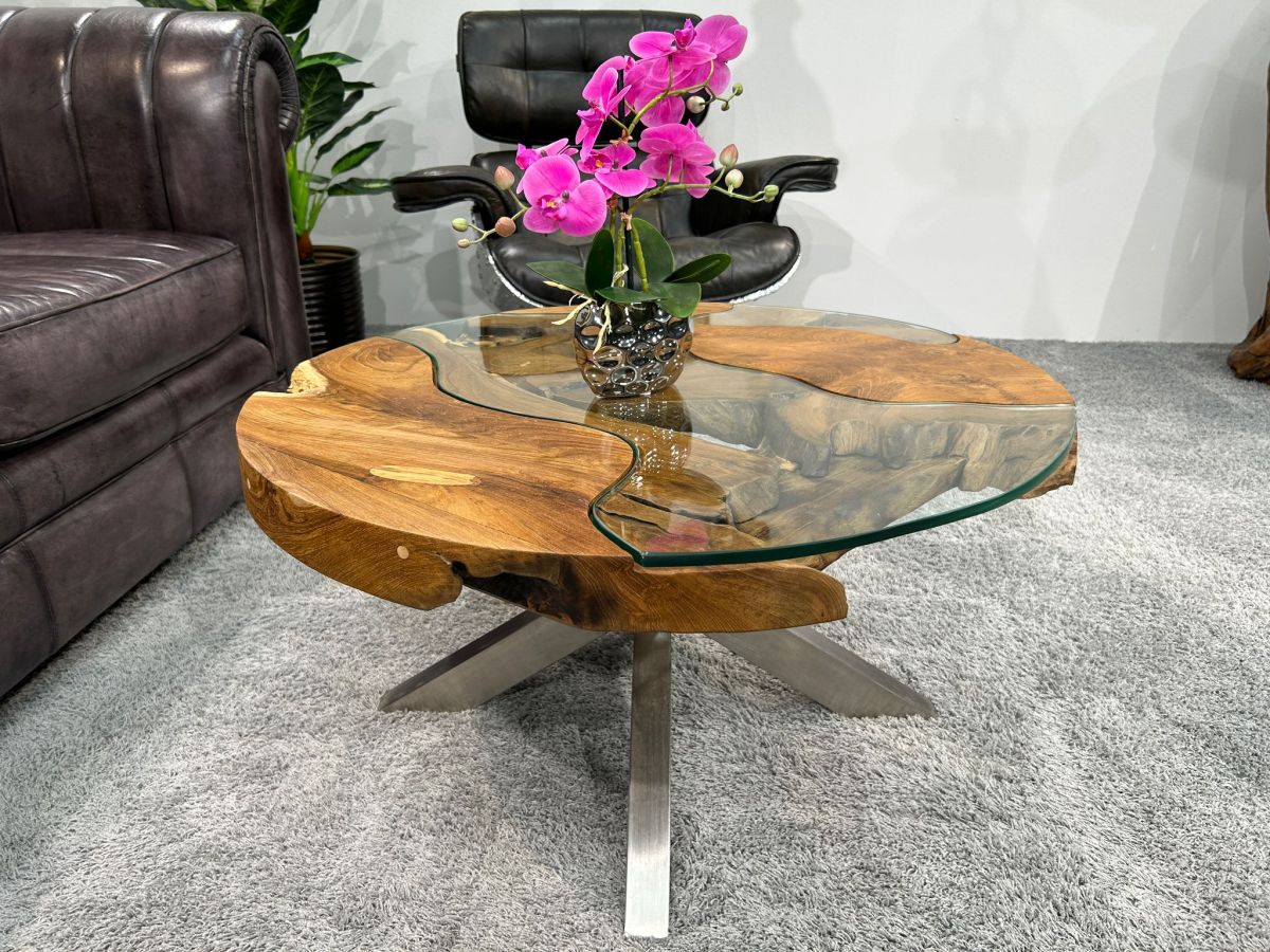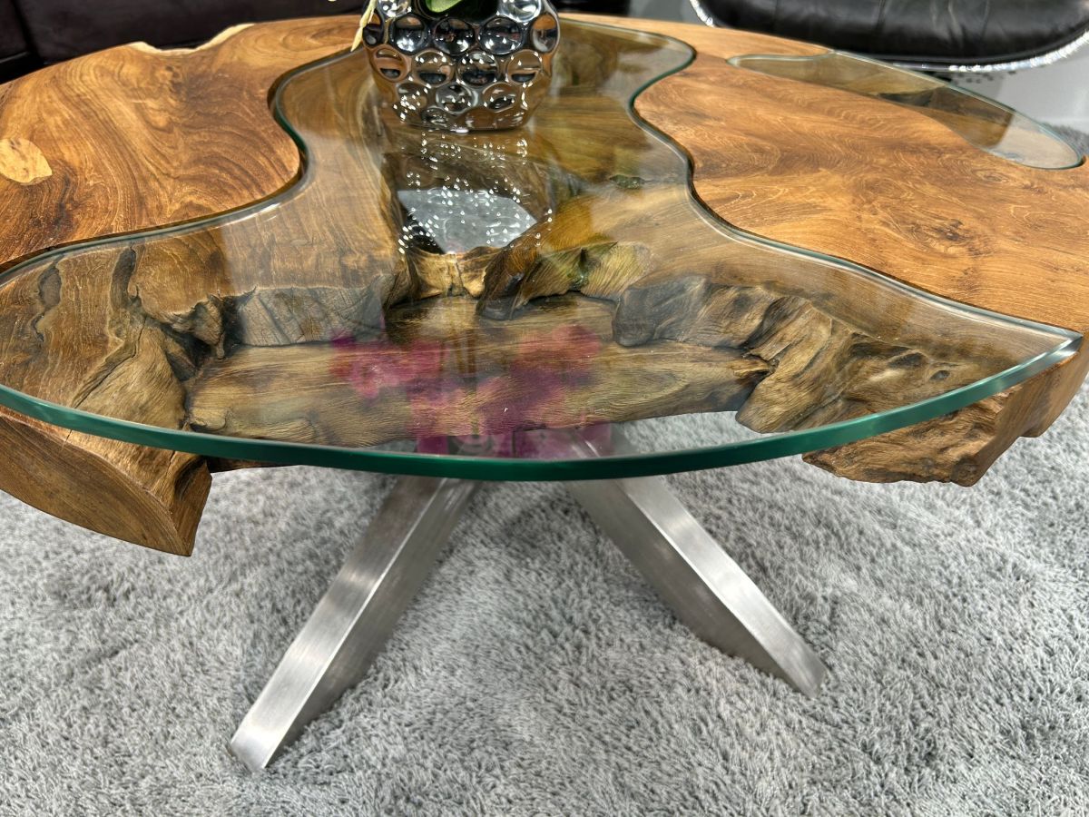 Material: Diverse Baumscheiben aus alten Teakbaumwurzeln, Glaseinlage und Tischgestell aus Edelstahl (Kreuzform)
