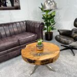 Ein beeindruckender runder Couchtisch aus Holz ist der Couchtisch „Sunrise“ aus einer massiven Baumscheibe.