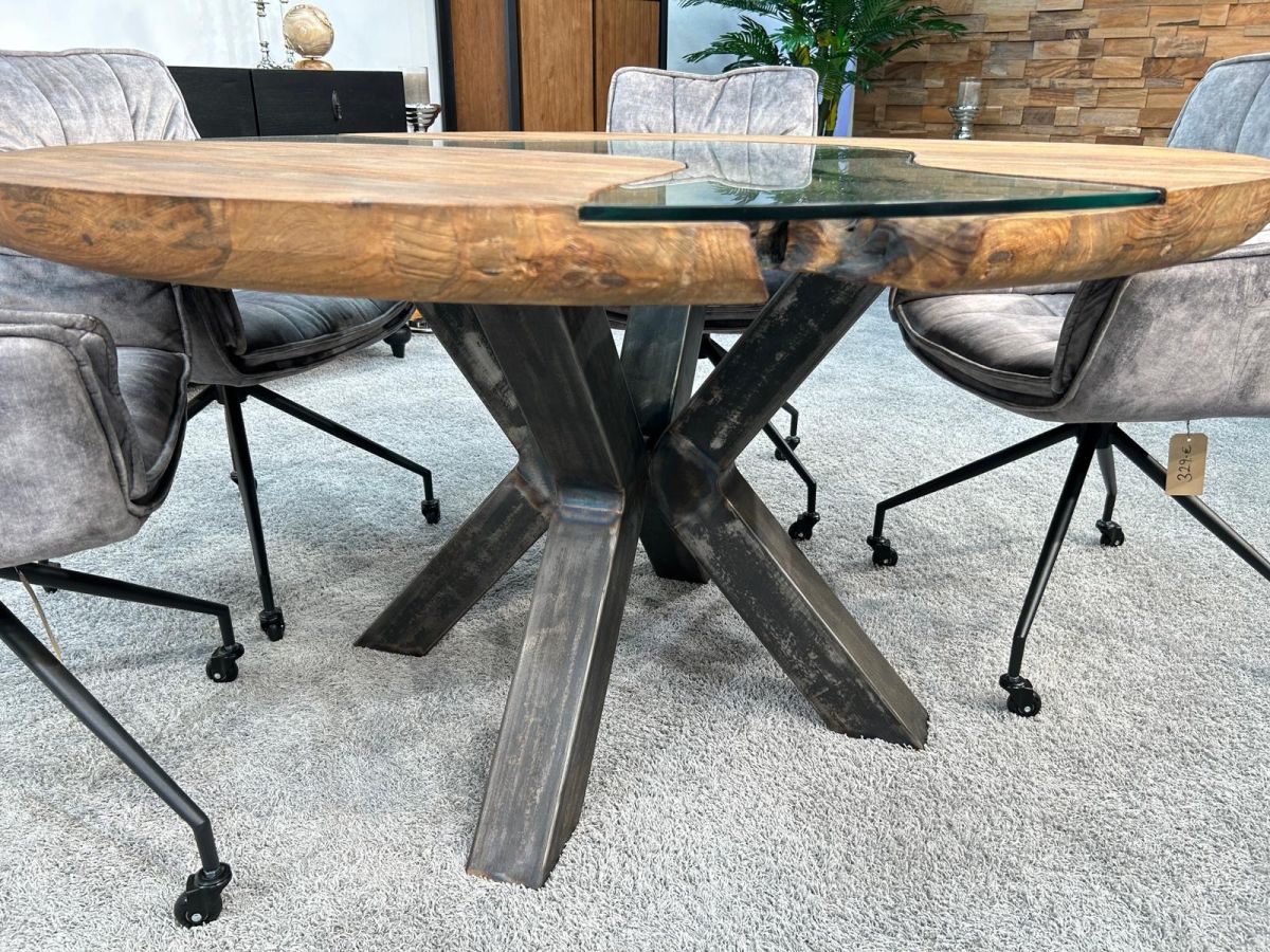 Die runde Tischplatte steht auf einem kreuzförmigen Tischgestell aus Rohstahl, welches für hohe und wackelfreie Stabilität sorgt. Das Gestell wurde, ebenso wie die Tischplatte, in reiner Handarbeit gefertigt und eignet sich hervorragend für Wohnbereiche im Industriedesign, aber auch als Highlight in äußerst modernen Einrichtungsstilen.