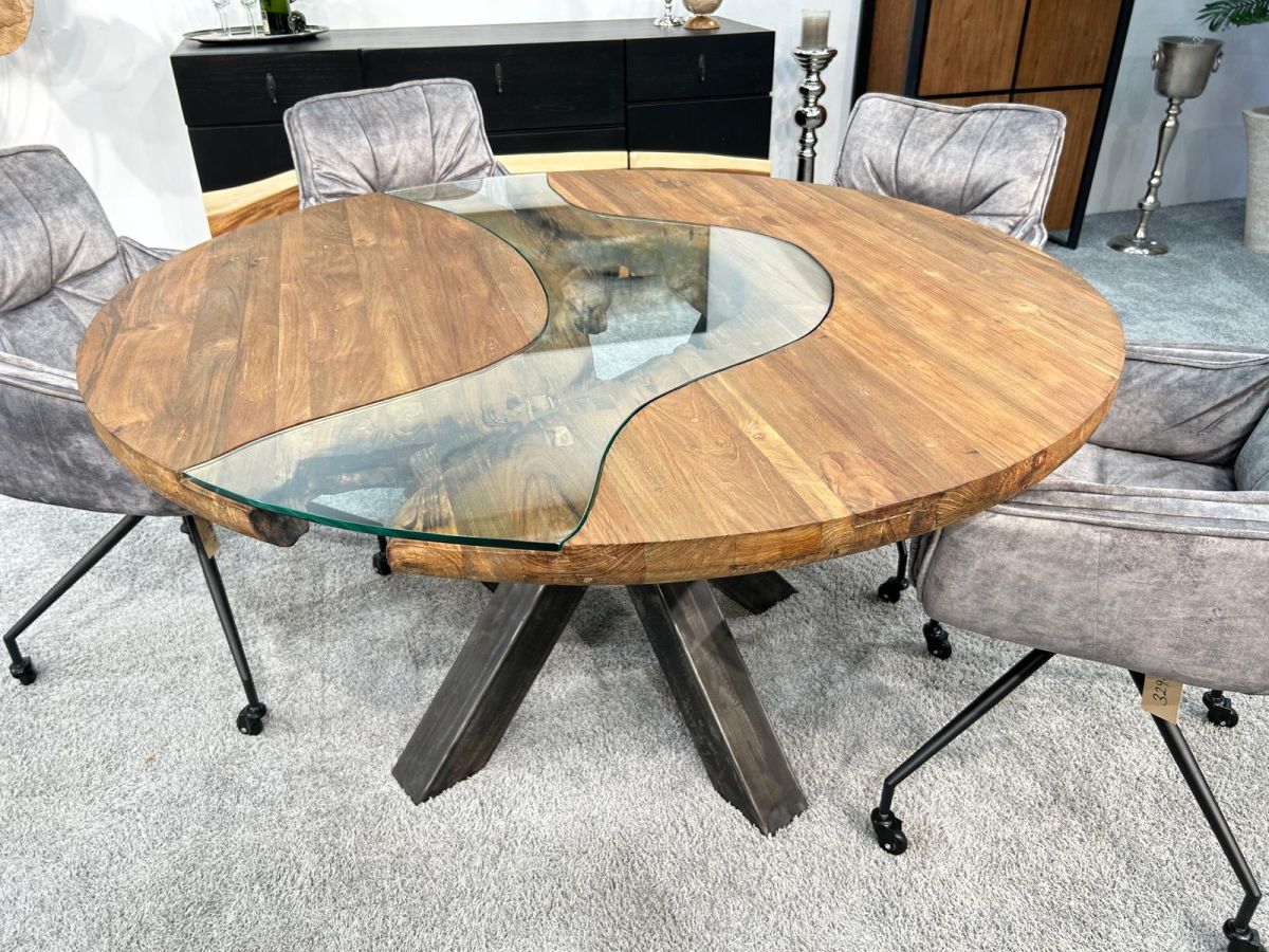 Der runde Massivholz Esszimmertisch ETERNIA kombiniert in unverwechselbarer Weise die Materialien Massivholz, Rohstahl und Glas in einer besonderen Gestaltung. Die massive Tischplatte mit einem Durchmesser von 140 cm besteht aus sorgfältig verleimten Massivholzbohlen aus Teakholz, die mit einem hochwertigen Möbelwachs versiegelt wurden, um ihre natürliche Struktur und Haptik zu bewahren. Alternativ bieten wir Dir gerne an, die Holzoberfläche mit einem seidenmatten Möbellack auf Wasserbasis zu lackieren.