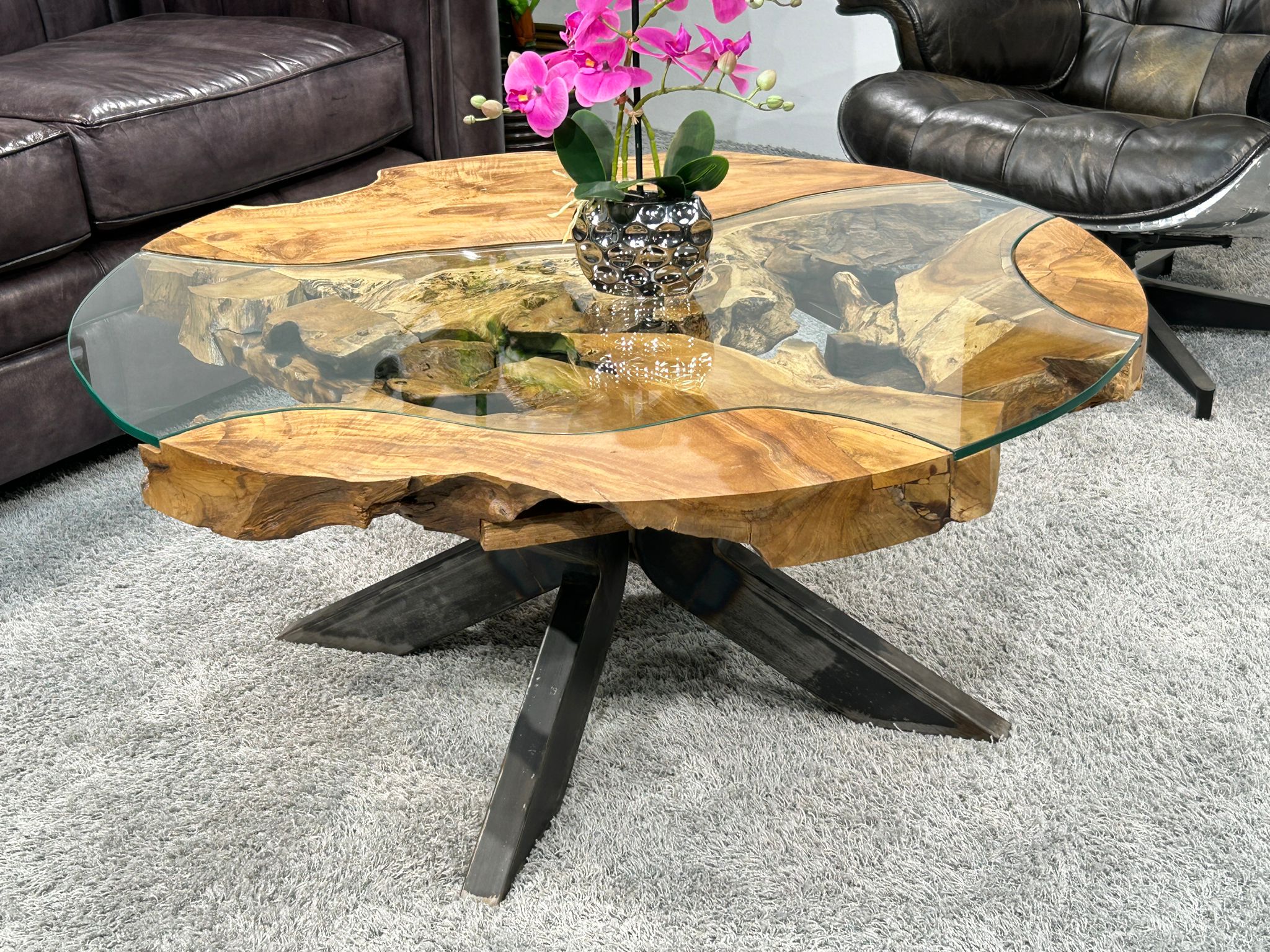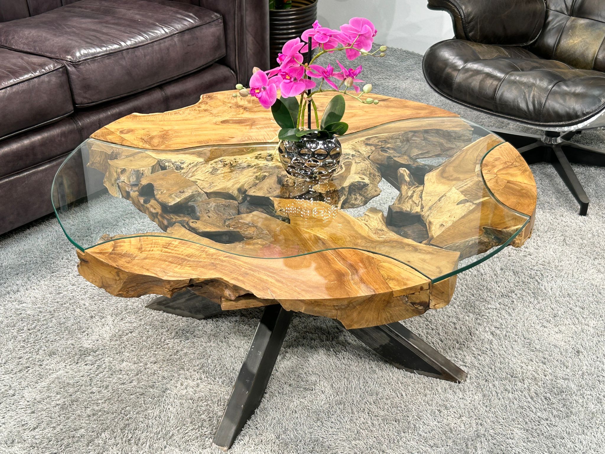 Ein Wohnzimmertisch rund aus Holz wird zu einer stilvollen Ergänzung für Dein Wohnzimmer. Der SUNRISE kombiniert hochwertiges Altholz mit modernen Designelementen und vereint Nachhaltigkeit mit einem zeitlosen Design. Der Tisch besteht aus massiven Baumscheiben, die durch handgefertigte Glaseinlagen ergänzt werden, wodurch eine Mischung aus natürlichem holz, Glas und Rohstahl entsteht.