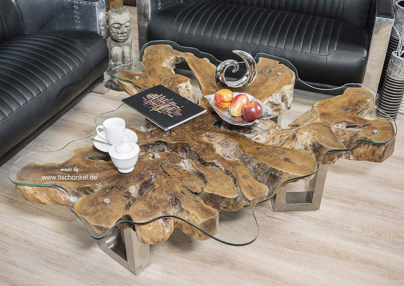 Rustikaler Couchtisch aus einer Baumwurzel mit Glasplatte