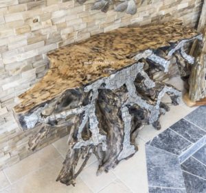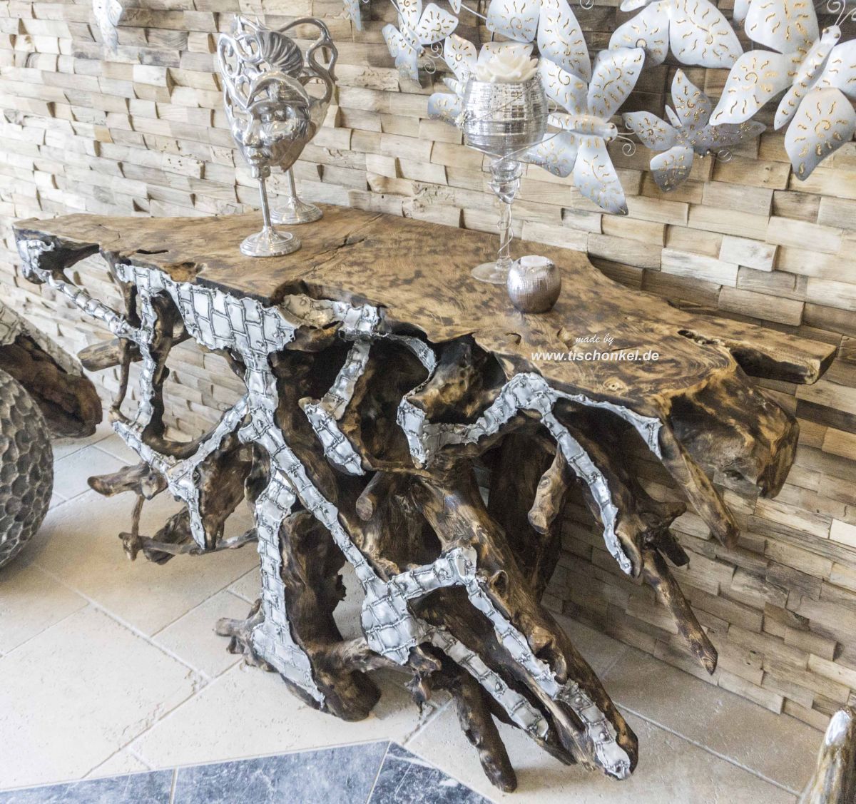 Beeindruckendes Sideboard aus einer Baumwurzel mit Applikationen aus Aluminium