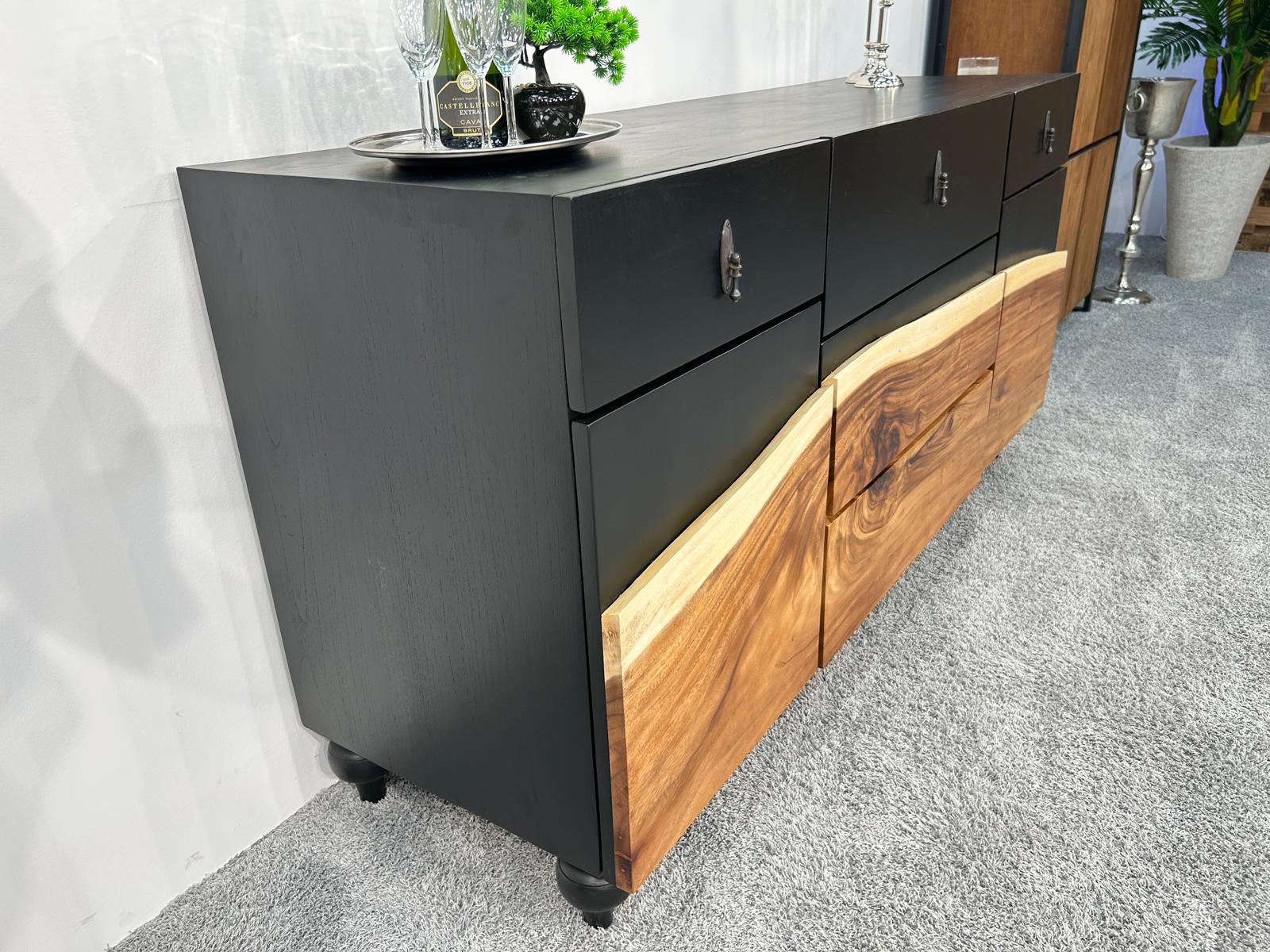 Möbel der Serie „Black Forest“ haben ein interessantes Konzept aus schwarz lackiertem recyceltem Holz und Applikationen aus Baumscheiben Suar. Dadurch hat jedes handgefertigte Sideboard bzw. Anrichte aus recyceltem Teakholz mit Suar Baumscheibe seinen einzigartigen Charme und besticht durch ein außergewöhnliches Naturdesign. Die Baumringe der Baumscheiben und die unvergleichlichen Holzstrukturen machen jedes Sideboard zu einem Unikat, das seinesgleichen sucht. Eine Besonderheit des Sideboards sind die Türen, die in künstlerischer Handarbeit aus diversen Holzteilen zusammengesetzt wurden. Das Sideboard steht auf Holzfüßen, die Handgriffe der Türen bestehen aus schwarz lackiertem Stahl.