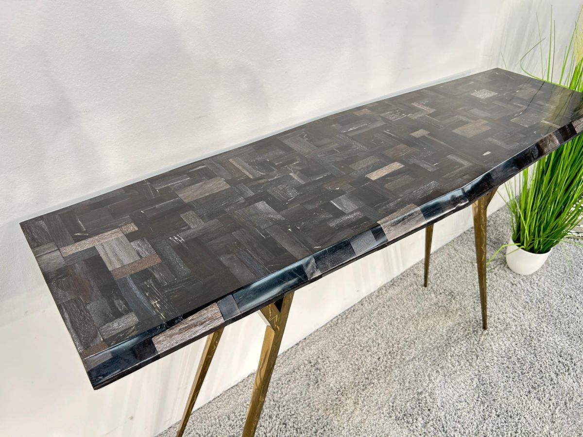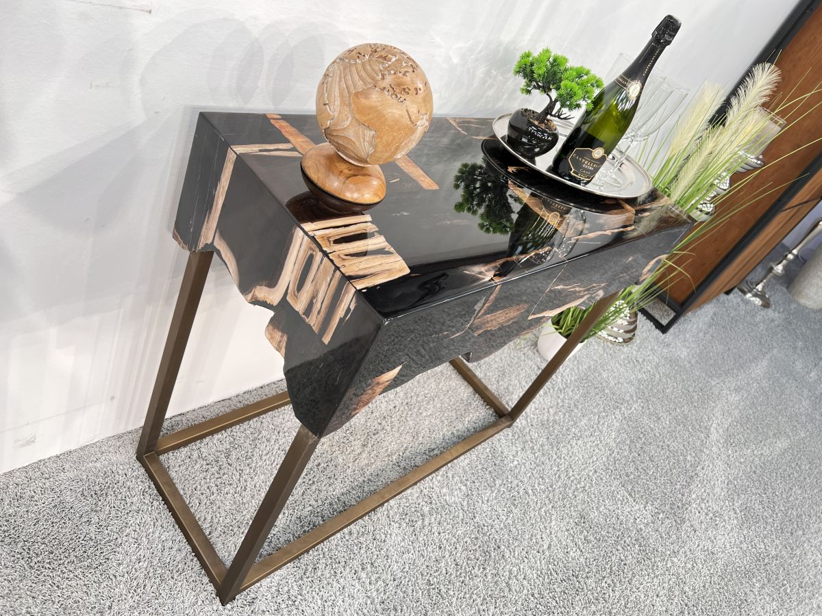 Materialien: Versteinertes Holz, Gestell aus Stahl in Messing-Optik