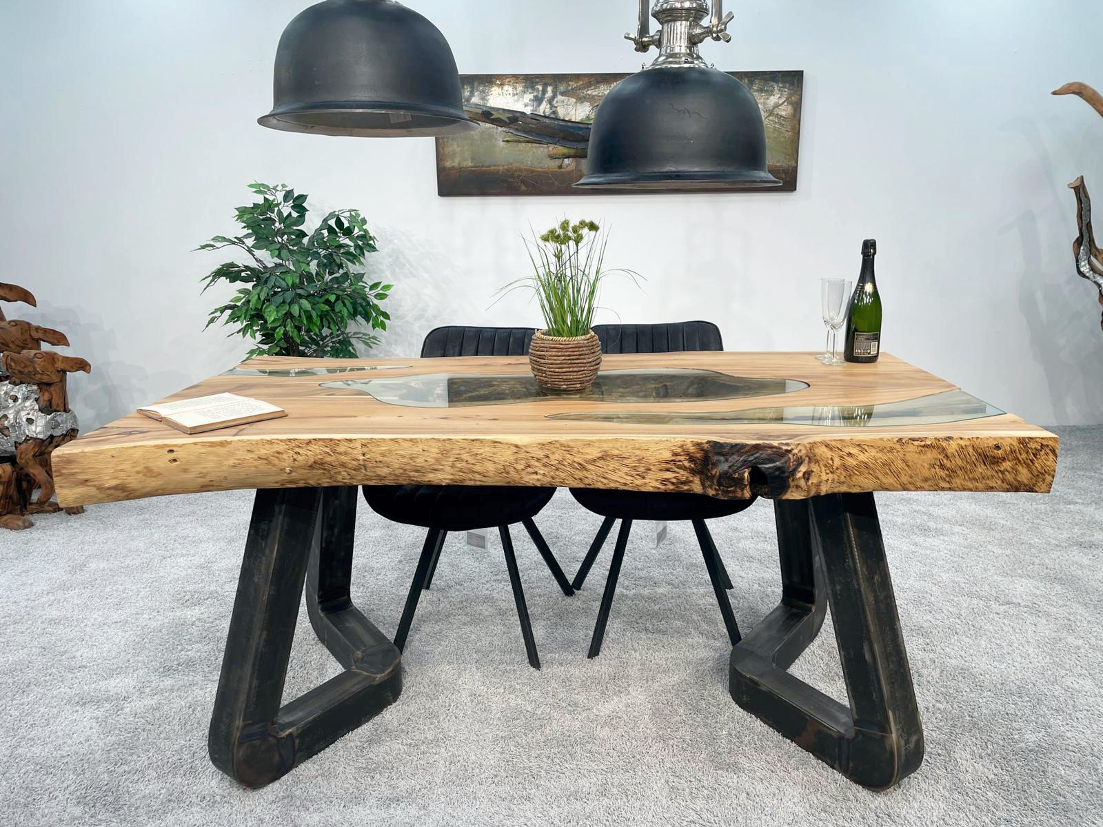 Heute stellen wir Ihnen einen ungewöhnlichen Tisch aus der Serie LAKESIDE vor. Der Esstisch besteht aus verschiedenen Massivholzbohlen (Suar), die in Teilen in ihrer natürlichen Form belassen wurden. Die somit entstandenen Löcher und Zwischenräume wurden mit aufwendig in Handarbeit hergestellten Glaseinlagen versehen. Der Esstisch steht aus zwei ebenfalls ungewöhnlichen Tischkufen aus Rohstahl im Industriedesign.