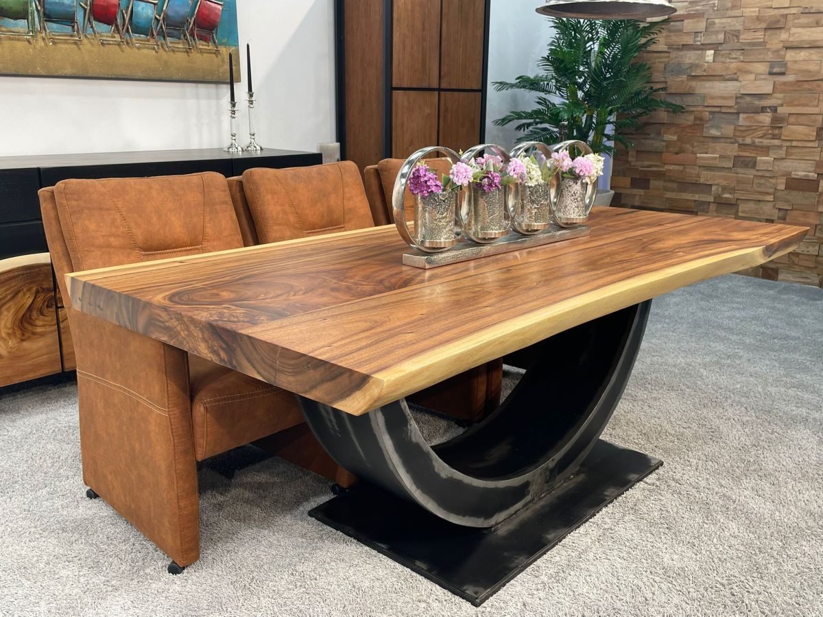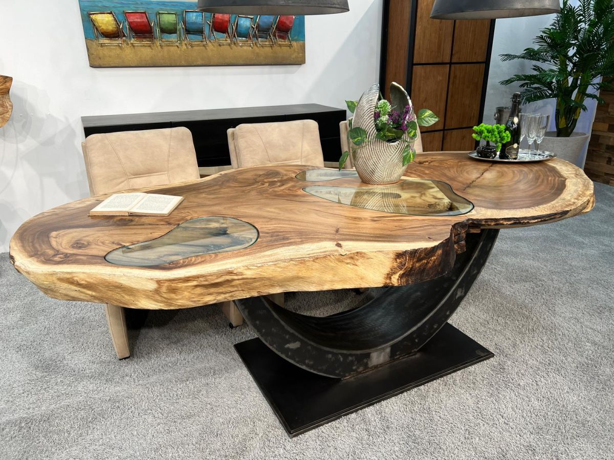 Modell: Esstisch Baumscheibe „Expression Suar“ Format: Länge ca. 248 cm, Breite ca. 76-118 cm, Höhe ca. 79 cm. Die Stärke der Tischplatte beträgt ca. 10,5 cm. Material: Massive Baumscheibe (Suar), Tischgestell aus Rohstahl aus der Serie Halbmond und dekorativen Glaseinlagen