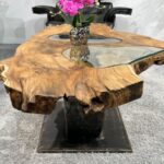 Dieser außergewöhnliche Couchtisch „Expression“ ist aufgrund seiner natürlichen Form schon sehr selten. Die Tischplatte wurde aus massiven Baumscheiben gesägt und in reiner Handarbeit verleimt, geschliffen und gewachst. Das Tischgestell im Industrielook wurde eigens für diesen Couchtisch aus Holz angefertigt und besteht aus Rohstahl aus der Serie „Halfmoon“. Da die Baumscheiben in ihrer ursprünglichen Form und Struktur eine innenliegende Baumkante, sowie natürlich entstandene Verwachsungen aufwiesen, wurde der Zwischenraum aufwendig mit einer von Hand geschnittenen Glasplatte verziert. Durch die Verwendung von Baumscheiben aus dem Bereich der Baumwurzel entsteht zusätzlich eine sehr beeindruckende Optik.