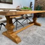 Bei diesem Esstisch handelt es sich um einen außergewöhnlich schönen „Klostertisch“ aus Teakholzbohlen. Verwendet wurden hier ausgewählte Teakholzbohlen, welche in reiner Handarbeit zusammengefügt werden. Die Tischplatte auf einem aufwendigen, ebenfalls aus Teakholz hergestelltem Tischgestell platziert. Je nach Ihren Bedürfnissen gibt es das Modell auch mit einem Teakholz-Gestell, das weiß lackiert ist. Dadurch entsteht ein beeindruckender Kontrast zur Tischplatte. Passend zu diesem Designklassiker wurde die Oberfläche des Tisches gebürstet und mit einem natürlichen Möbelwachs behandelt, um die rustikale Optik zu unterstreichen.