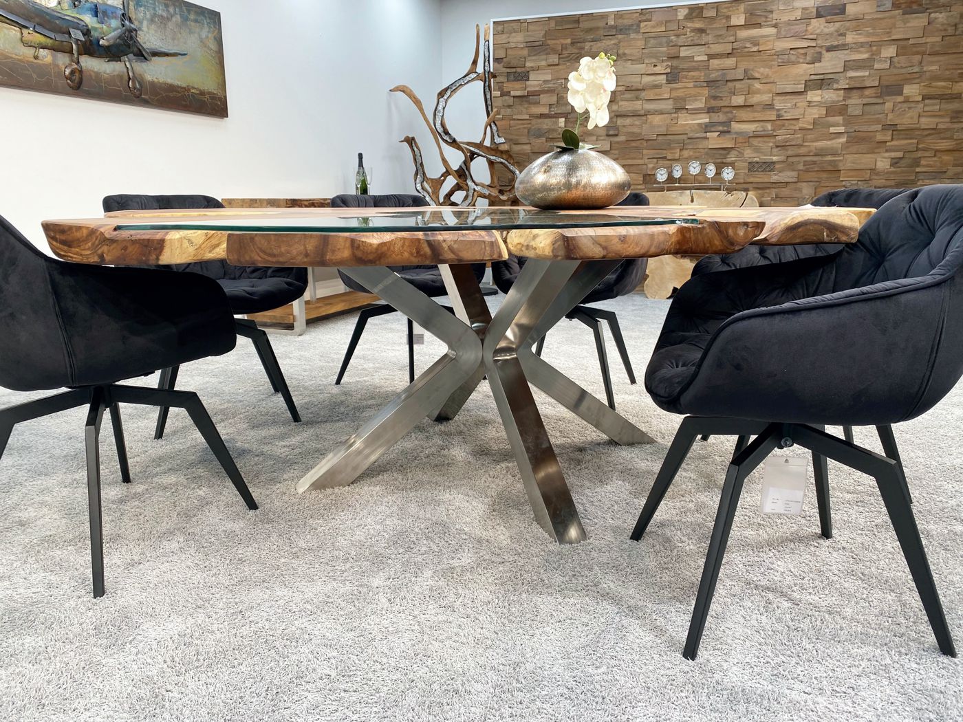 Material: Baumscheibe aus einem Baumstamm Suar, Tischgestell aus Edelstahl, Glaseinleger, komplett in Handarbeit gefertigt