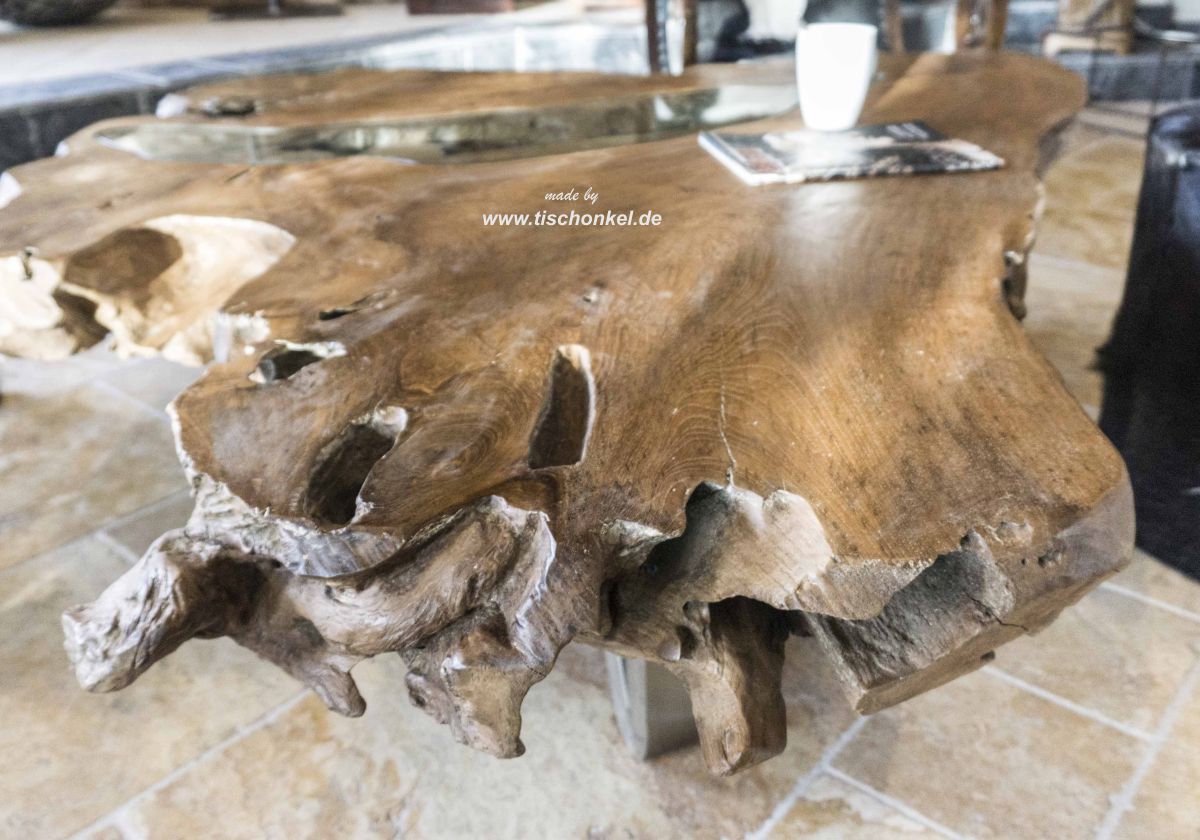 Mit diesem Wohnzimmertisch aus einer Baumwurzel ziehen Sie die Blicke aus sich. Die Baumwurzel stammt von einem Teakbaum und hat eine Stärke von sagenhaften 20 cm. Ein natürlich gewachsenes Loch in der Baumwurzel wurde kunstvoll mit einer Glasplatte versehen. Der Wohnzimmertisch steht aus drei Tischbeinen aus Edelstahl. Jede Komponente dieses Wohnzimmertisches wurde in reiner Handarbeit gefertigt und somit ist dieser tolle Wohnzimmertisch aus einer Baumwurzel ein Unikat, welches es nie wieder geben wird.