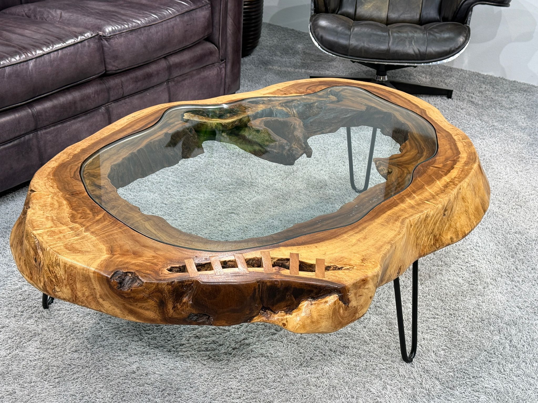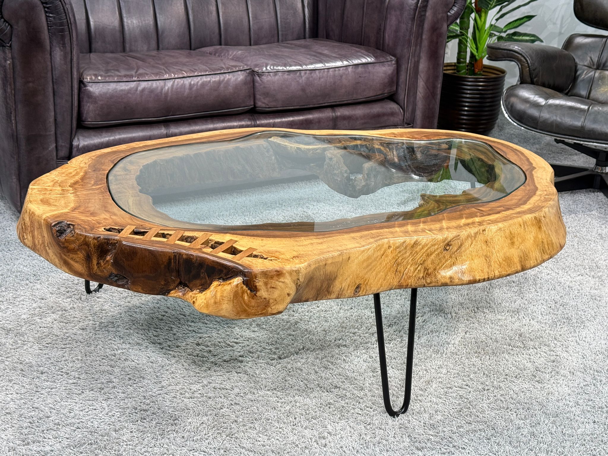 Startseite » Couchtisch » Couchtisch "Lakeside" » Wohnzimmertisch LAKESIDE, ca. 135 x 90 x 40 cm, aus einem Baumstamm (Suar)