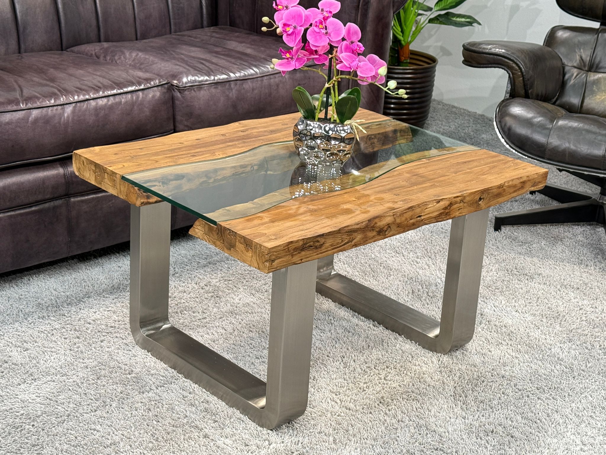 Der Couchtisch mit Glas „Old Elements“ kombiniert auf einzigartige Weise Altholz, Glas und Edelstahl zu einem modernen, stilvollen Möbelstück. Mit seinen Maßen von 80 x 60 cm und einer Höhe von 45 cm fügt sich dieser Couchtisch perfekt in verschiedene Wohnräume ein. Die Tischplatte besteht aus einer freihändig geschnittenen Glasplatte, die von zwei massiven Altholzbohlen seitlich gestützt wird. Die Tischkufen aus gebürstetem Edelstahl verleihen dem Tisch eine schwebende Leichtigkeit und unterstreichen die Verbindung moderner Designelemente mit recyceltem Holz.