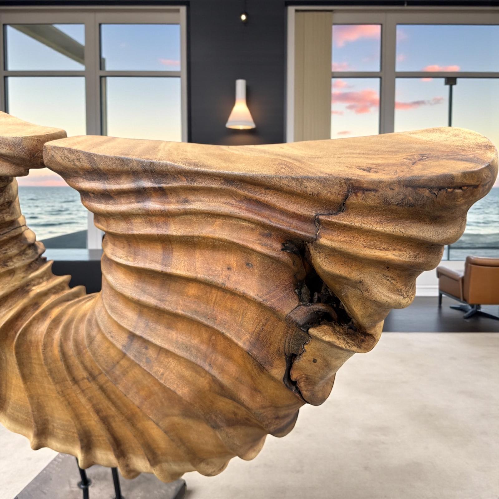 Diese außergewöhnliche Holzdekoration aus massivem Suar-Baumstamm vereint natürliche Ursprünglichkeit mit modernem Design. Das kunstvoll von Hand geschnitzte Halbkreis-Element besticht durch seine individuelle Maserung, organische Form und warme Holzfarbe – jedes Stück ist ein Unikat.