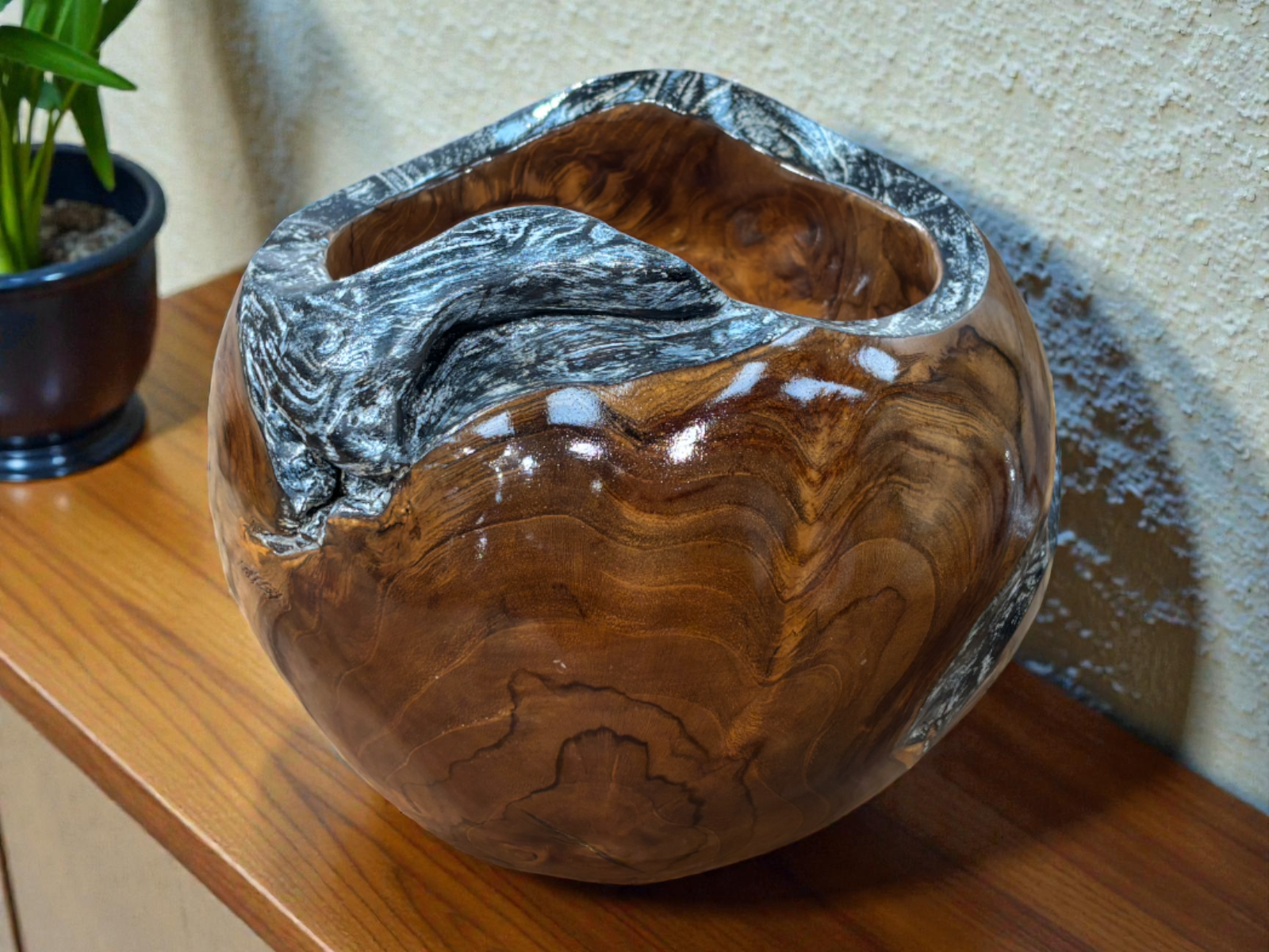 Der besondere Charme dieser Schale aus Holz zeigt sich in den feinen Details: Am oberen Rand setzt eine schwarz-silberne Akzentlinie einen modernen Kontrast zur warmen Holzoptik. Diese Kombination macht das Modell "Cecilia" zu einem vielseitigen Wohnaccessoire – ideal für Obst, Snacks, Schlüssel oder einfach als puristisches Designobjekt auf dem Esstisch oder Sideboard.