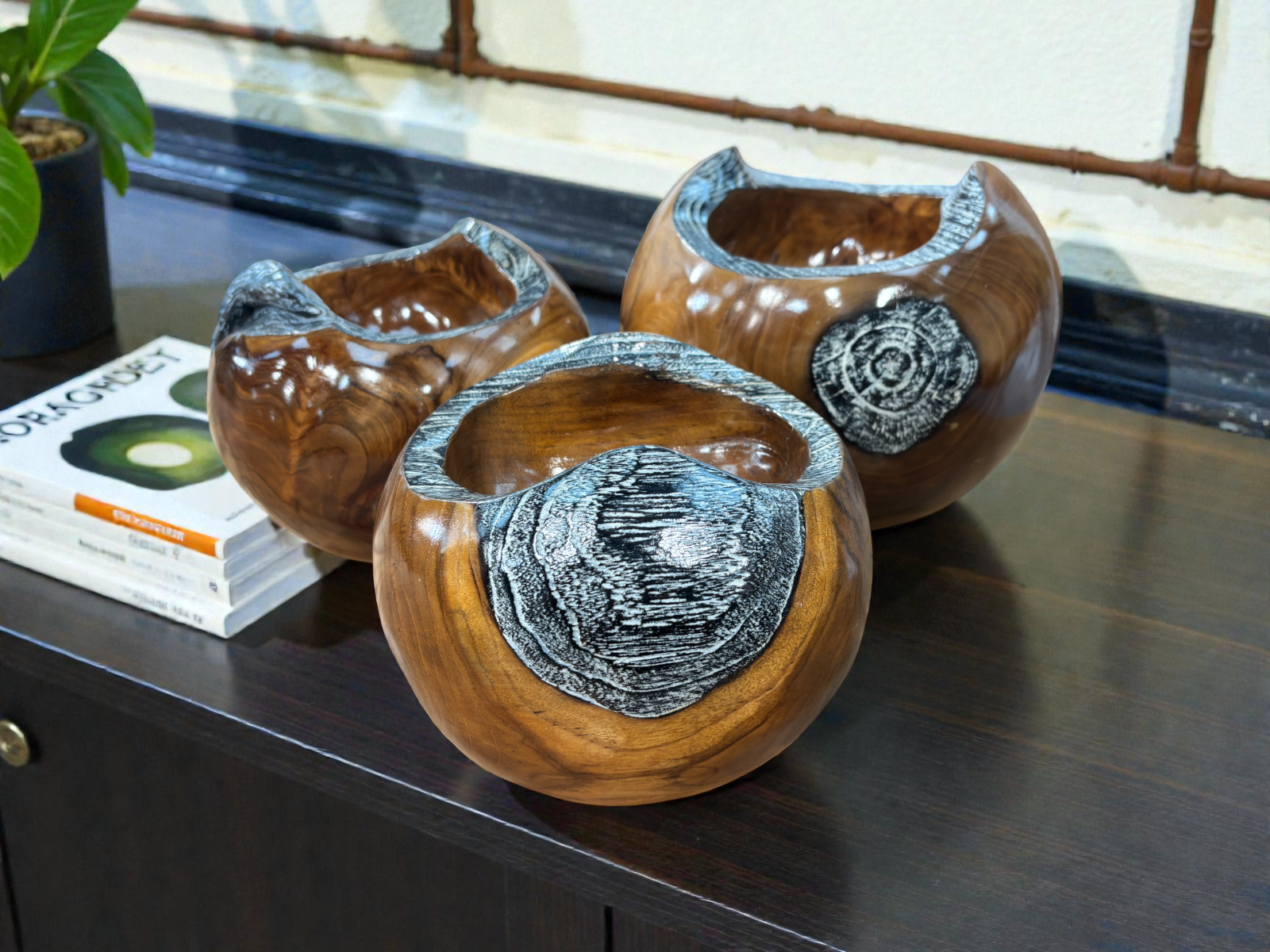 Der besondere Charme dieser Schalen aus Holz zeigt sich in den feinen Details: Am oberen Rand setzt eine schwarz-silberne Akzentlinie einen modernen Kontrast zur warmen Holzoptik. Diese Kombination macht das Set "Cecilia" zu einem vielseitigen Wohnaccessoire – ideal für Obst, Snacks, Schlüssel oder einfach als puristisches Designobjekt auf dem Esstisch oder Sideboard.