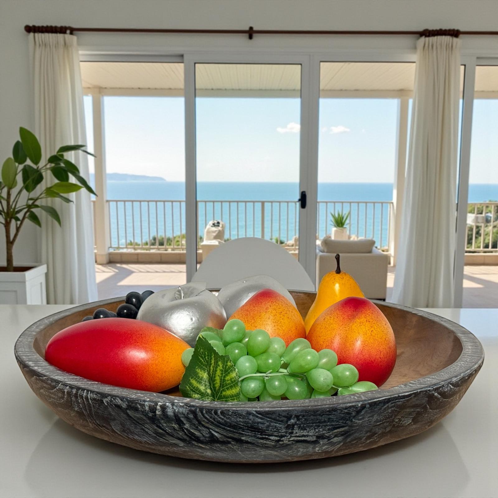 Ob als stilvolle Ablage für Obst, für dekorative Trockenblumen oder einfach pur als Designobjekt – diese Dekoschale aus Holz ist ein echtes Highlight für jede Einrichtung. Besonders gut wirkt sie auf großen Holzoberflächen wie einem Esstisch, auf einem eleganten Sideboard oder mittig auf einem Couchtisch. Ihre zurückhaltende Form passt sowohl zu modernem als auch zu natürlichem Interieur.Weitere handverlesene Accessoires findest du in der Kategorie Dekoration. Du möchtest die Schale vor dem Kauf live sehen? Dann besuche unsere Möbelausstellung in Detern mit über 6.000 m² Wohnideen zum Anfassen.