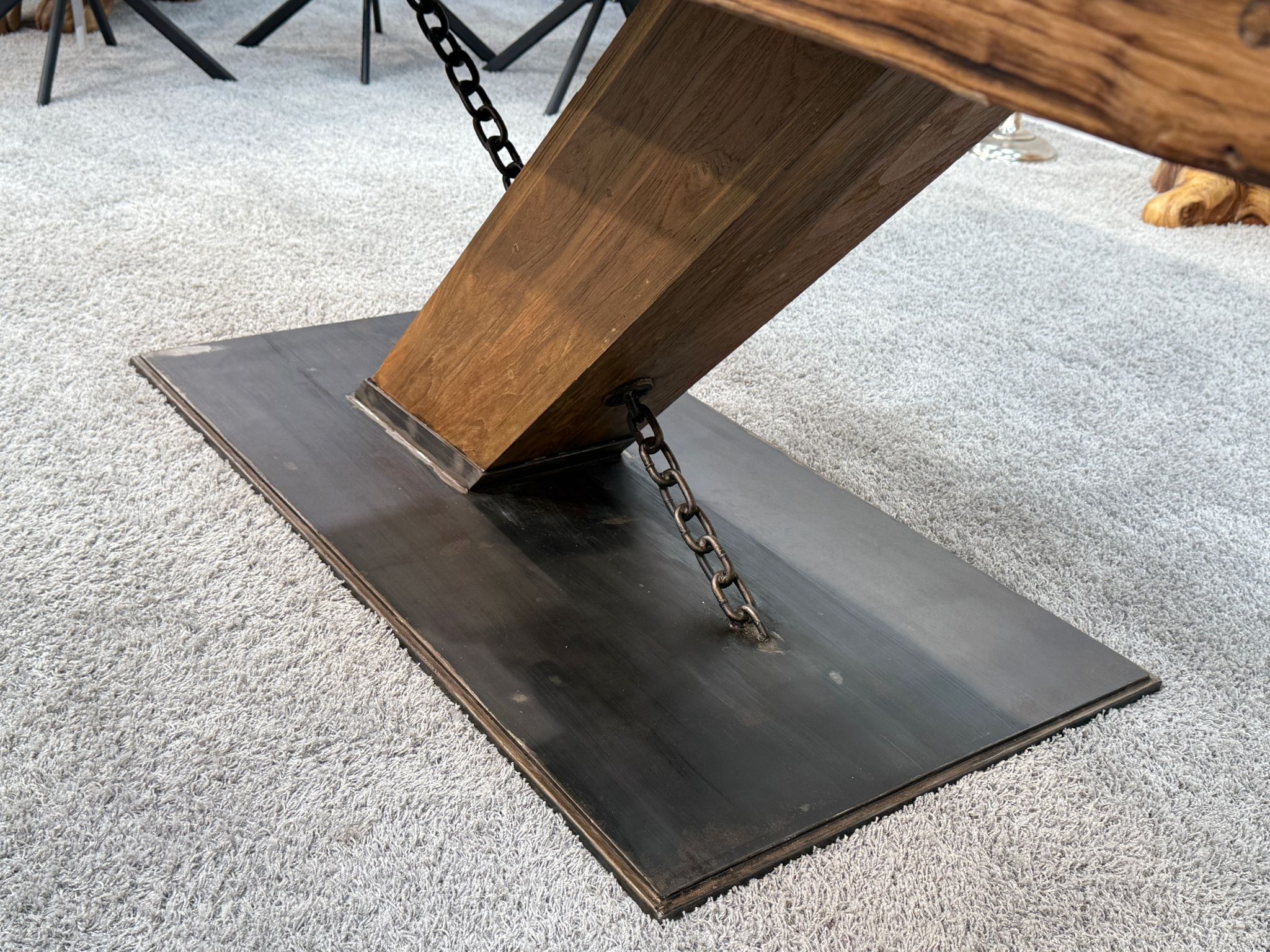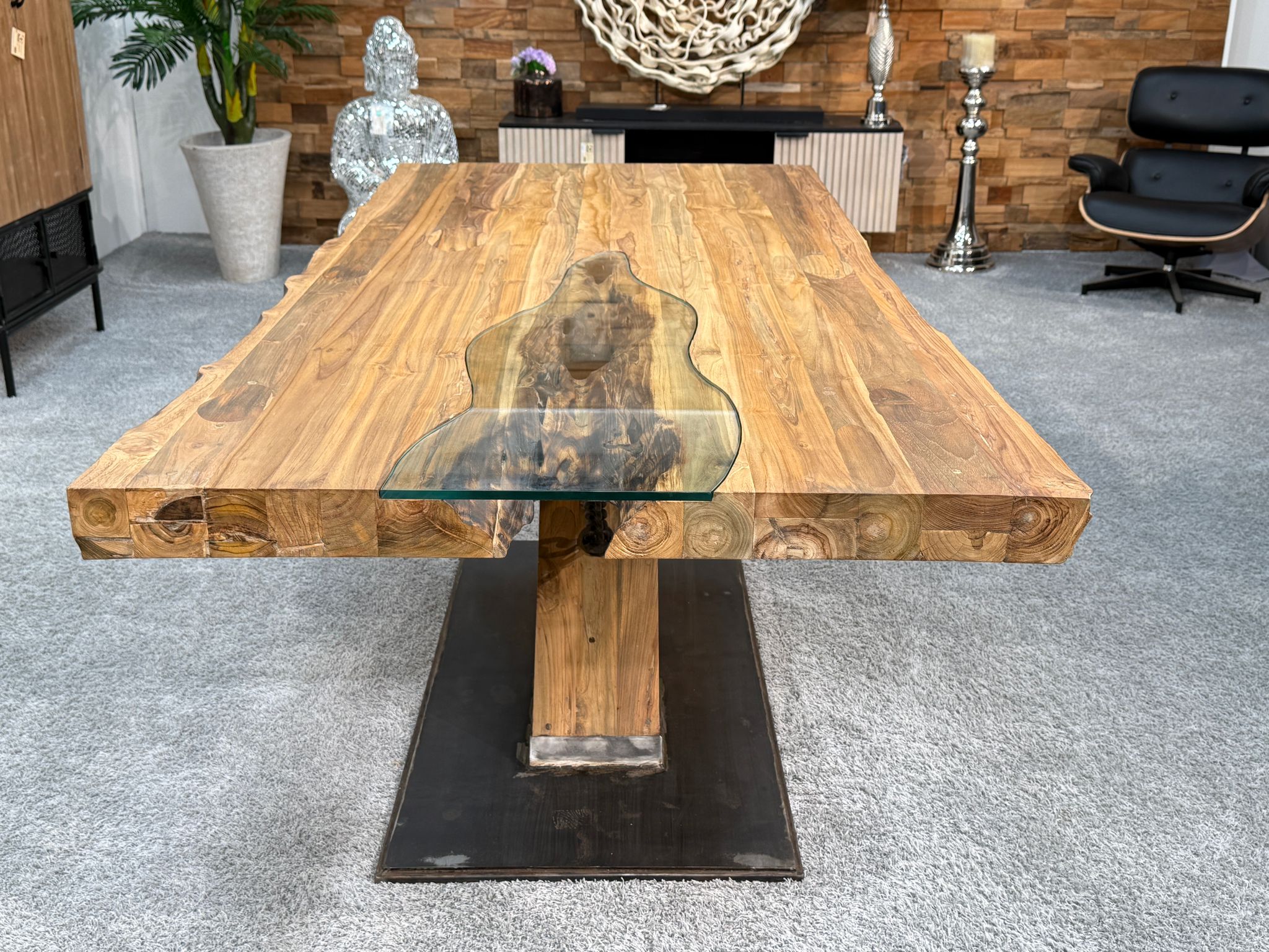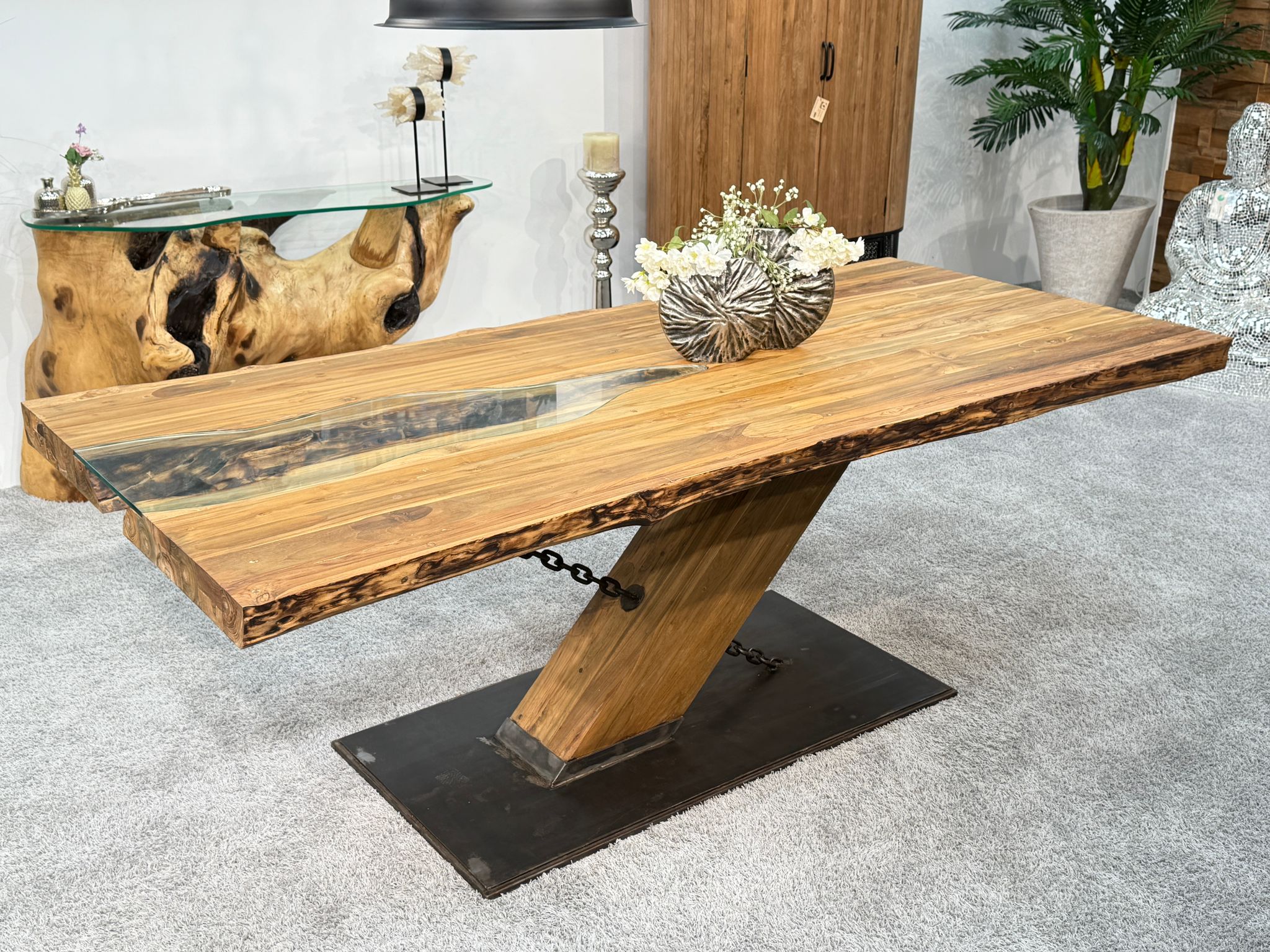 Das Design besticht durch eine beeindruckende, 7 cm starke Tischplatte aus massivem Teakholz mit charakteristischer Live-Edge-Kante. Ein besonderer Blickfang ist der kunstvoll eingearbeitete Glaseinsatz, der wie ein glitzernder Flusslauf wirkt. Getragen wird die Platte von einer Konstruktion, die ihresgleichen sucht: Ein massiver Holzfuß, stabilisiert durch echte Rohstahl-Ketten, ruht auf einer schweren Bodenplatte aus Rohstahl.