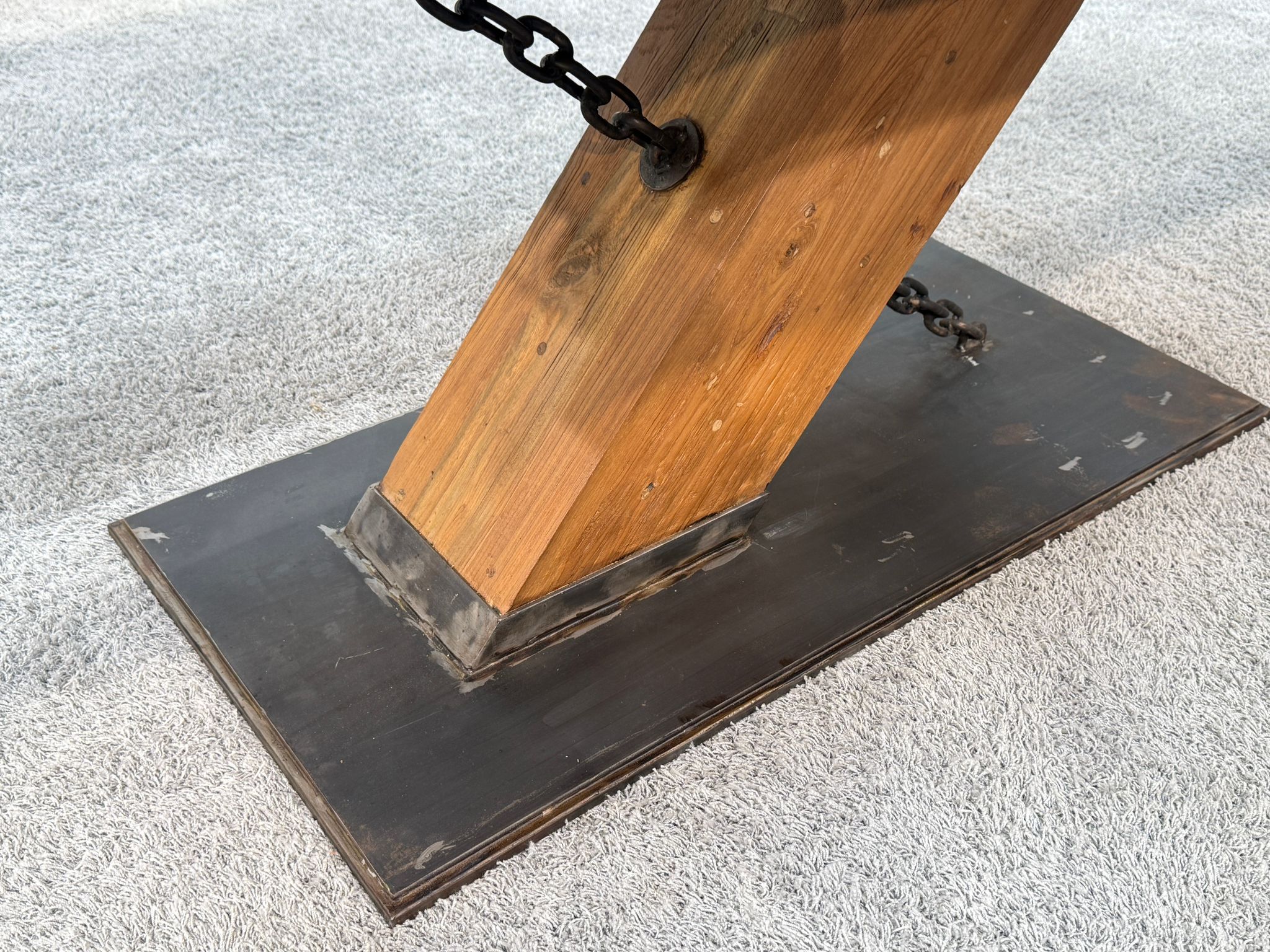 Da es sich um ein Naturprodukt handelt, ist jeder Tisch in seiner Maserung, Kantenführung und dem Verlauf der Glaseinlage ein echtes Einzelstück. Die Kombination aus dem warmen Teakholz und den kühlen, industriellen Elementen der massiven Ketten macht diesen Tisch zu einem skulpturalen Statement in Ihrem Wohnraum.