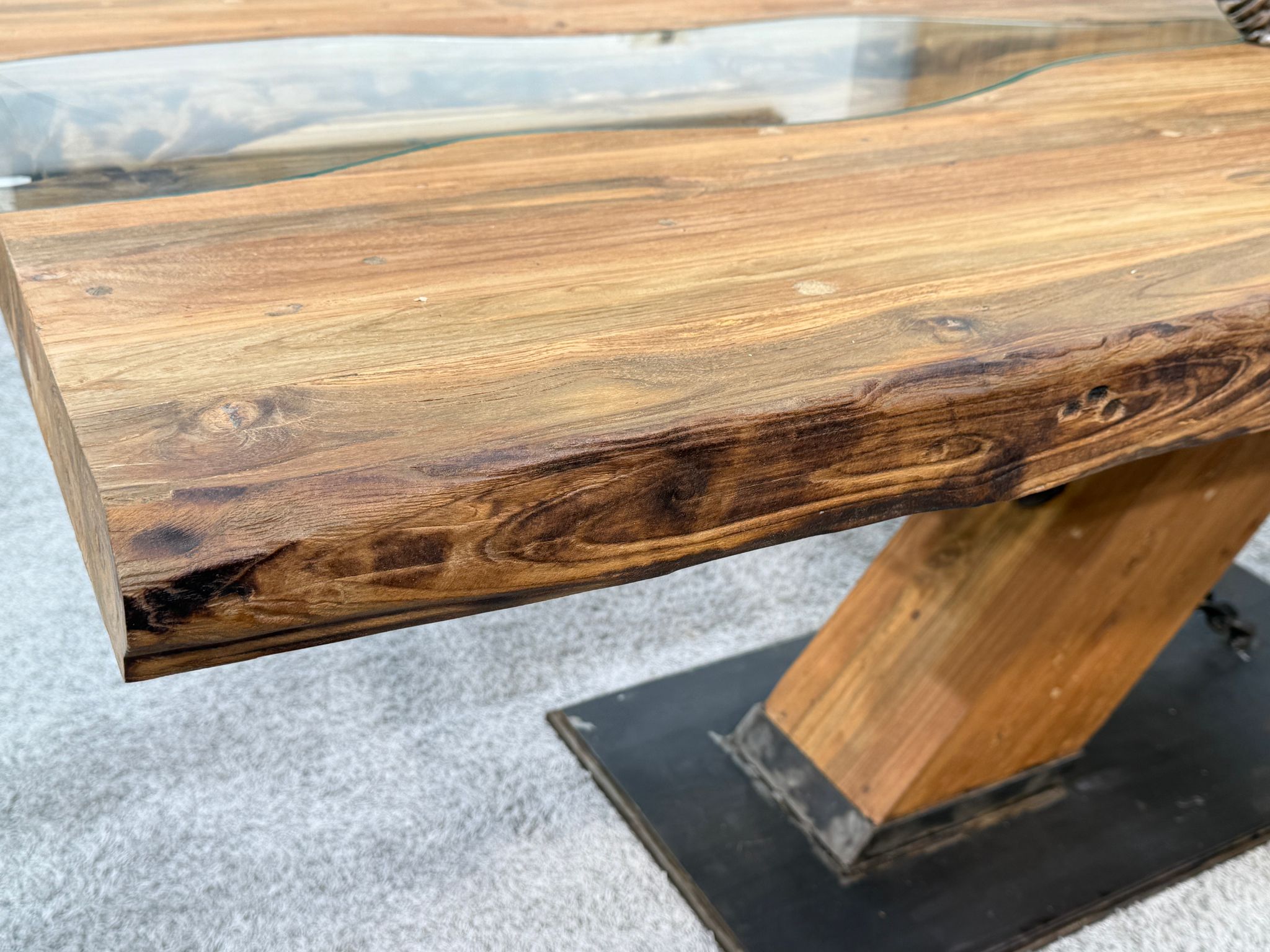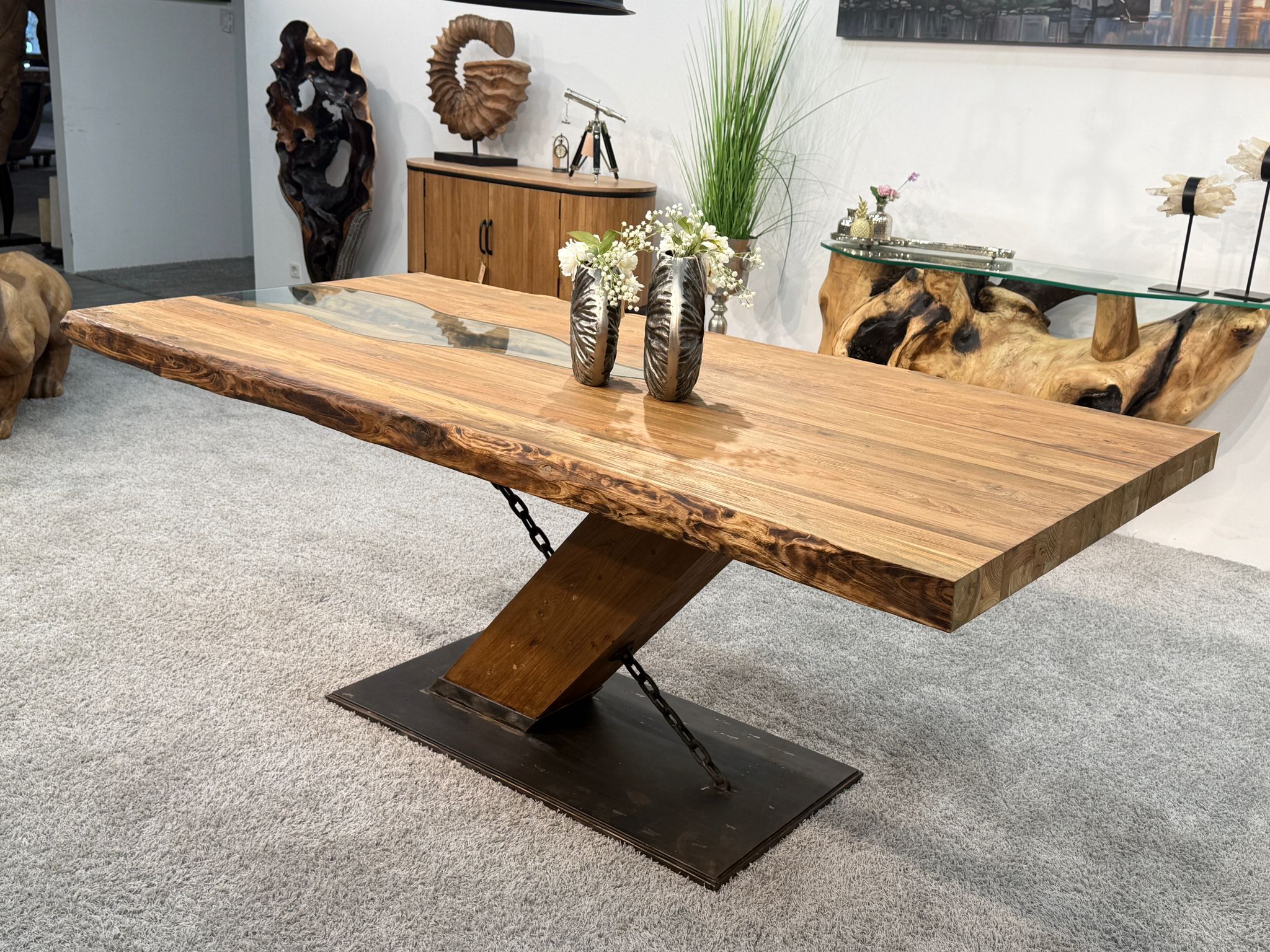 Das Design besticht durch eine beeindruckende, 7 cm starke Tischplatte aus massivem Teakholz mit charakteristischer Live-Edge-Kante (natürliche Baumkante). Ein besonderer Blickfang ist der kunstvoll eingearbeitete Glaseinsatz, der wie ein glitzernder Flusslauf wirkt. Getragen wird die Platte von einer Konstruktion, die ihresgleichen sucht: Ein massiver Holzfuß, stabilisiert durch echte Rohstahl-Ketten, ruht auf einer schweren Bodenplatte aus Rohstahl.