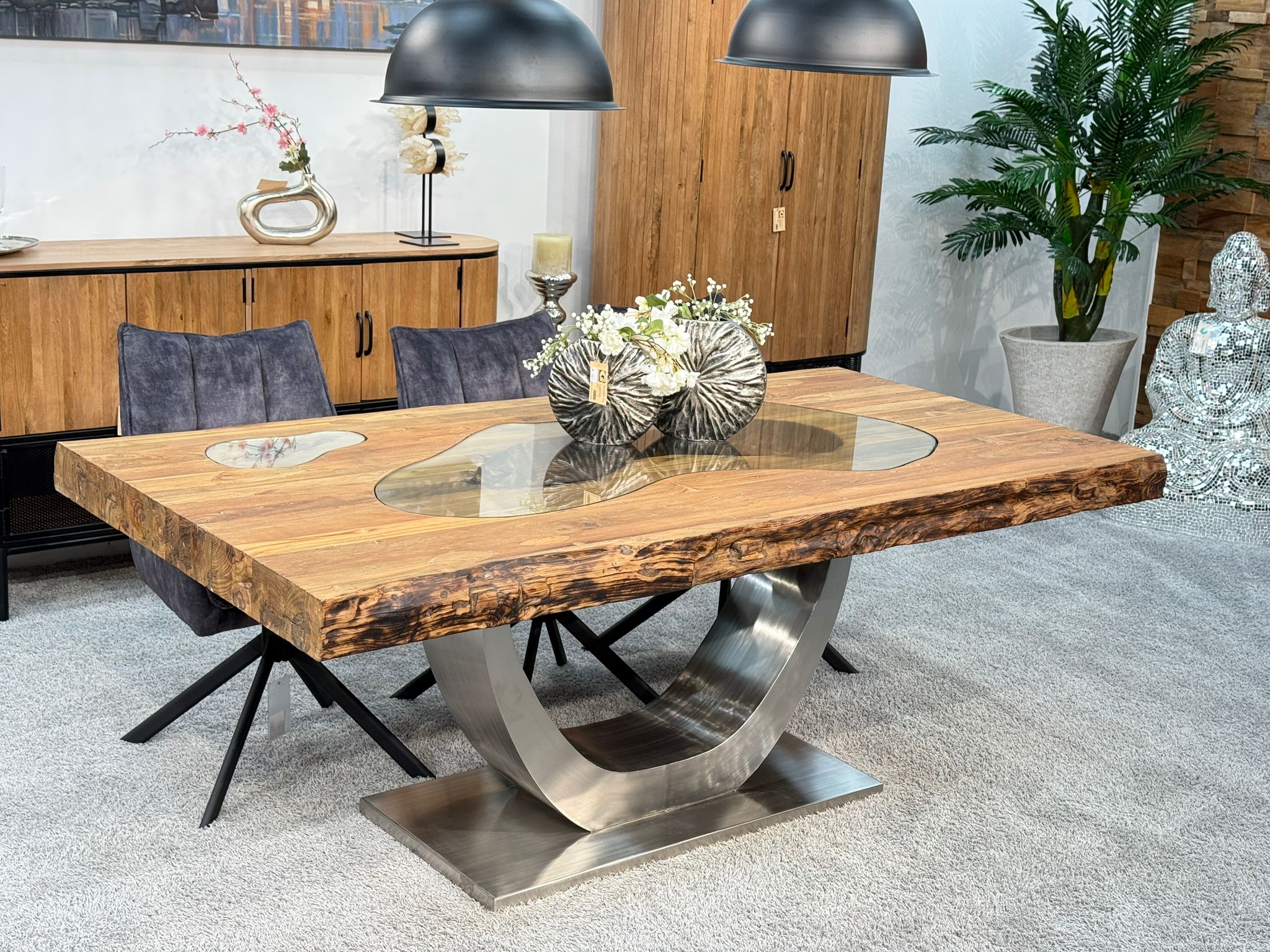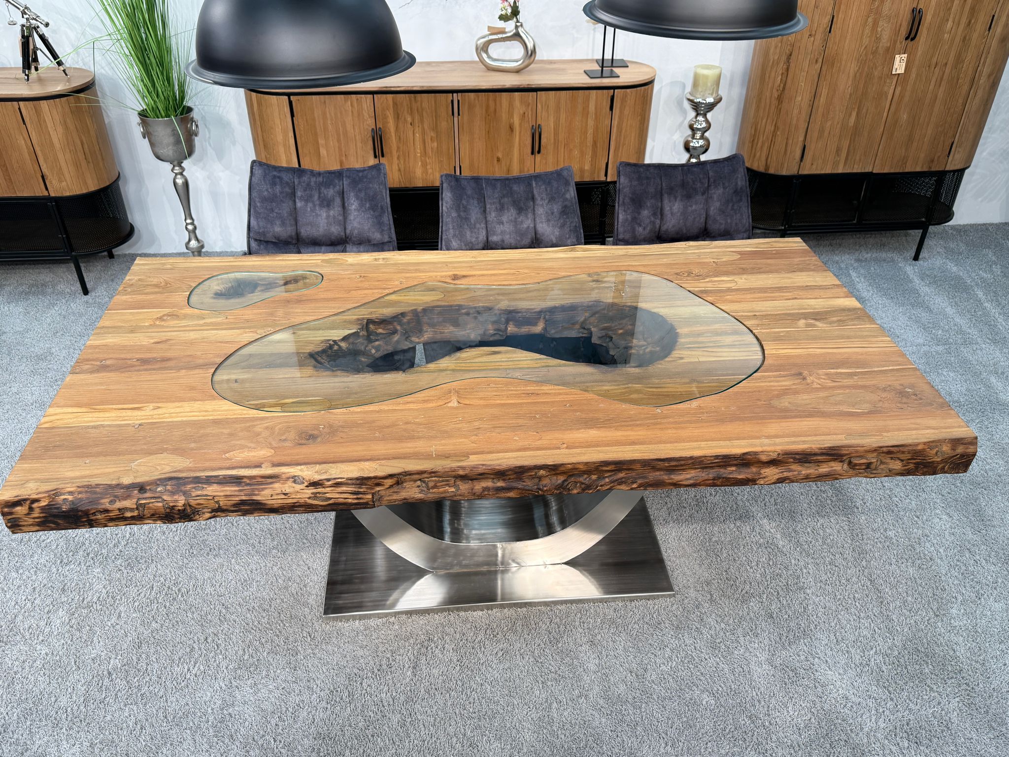 Modell: Esstisch "Deep Island" mit einem Tischgestell aus Edelstahl "Halbmond"