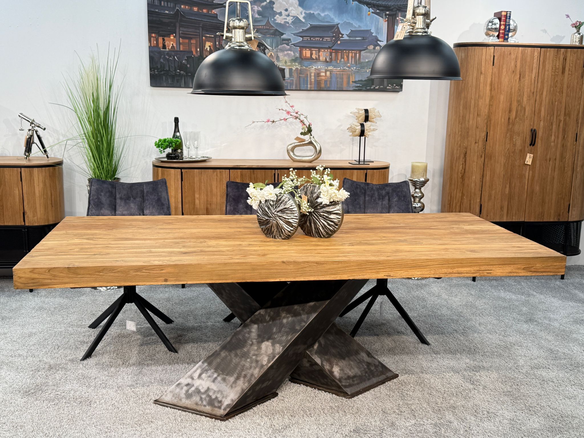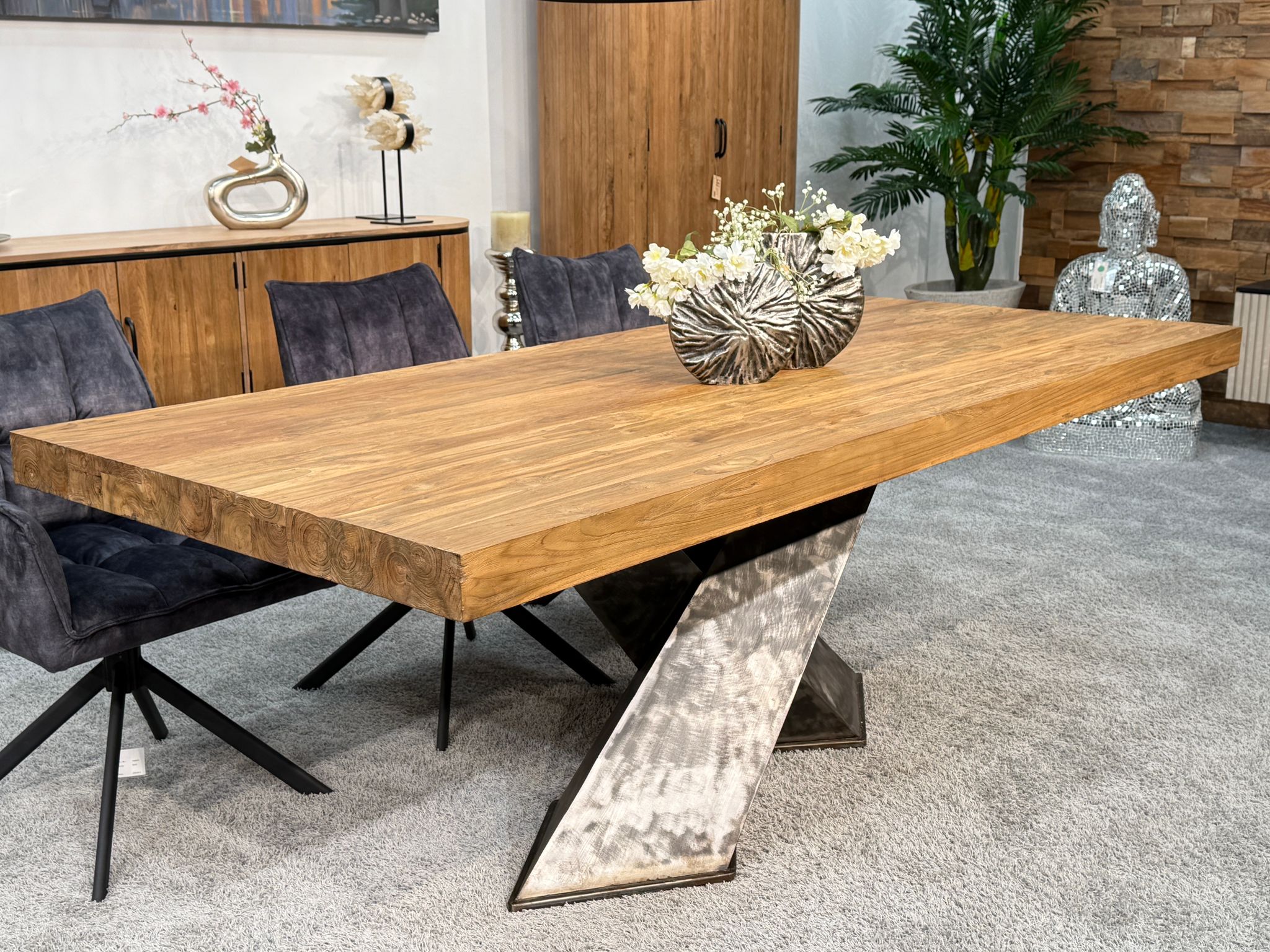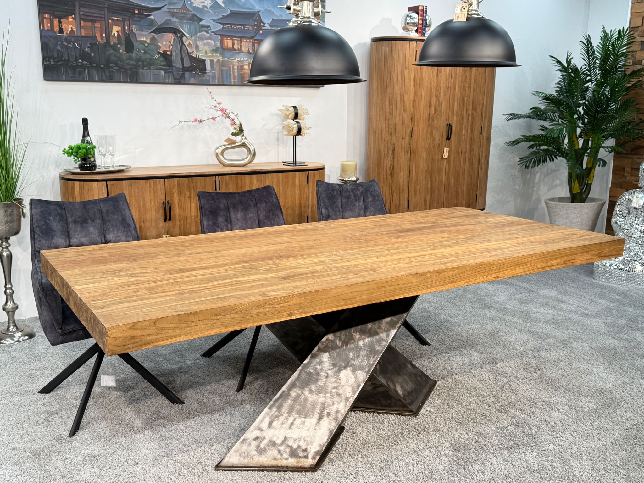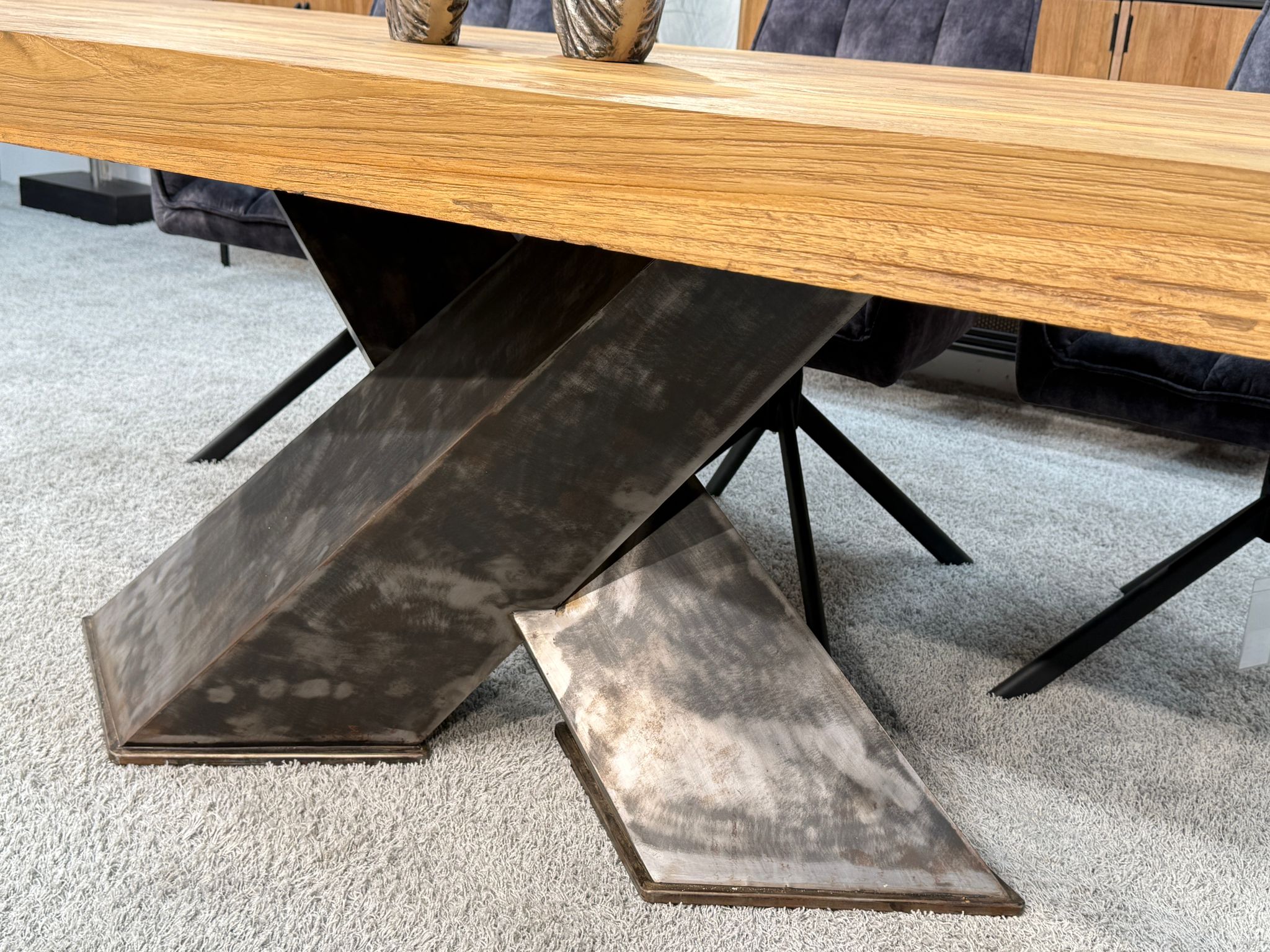 Startseite » Esstisch » Esstisch "Deep Island" » Esstisch "Deep Island" aus massivem Teakholz mit 3-D-Kreuzgestell aus Rohstahl ca. 220 x 100 x 79 cm