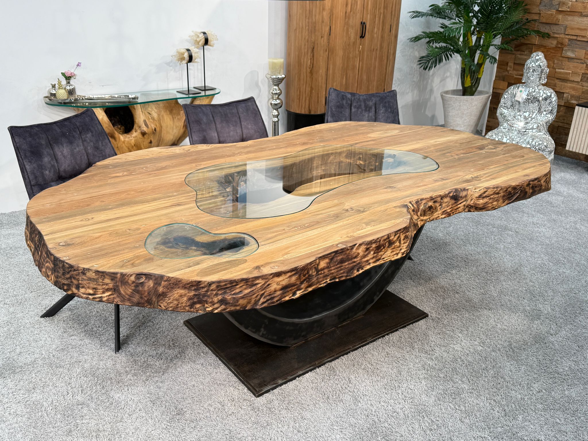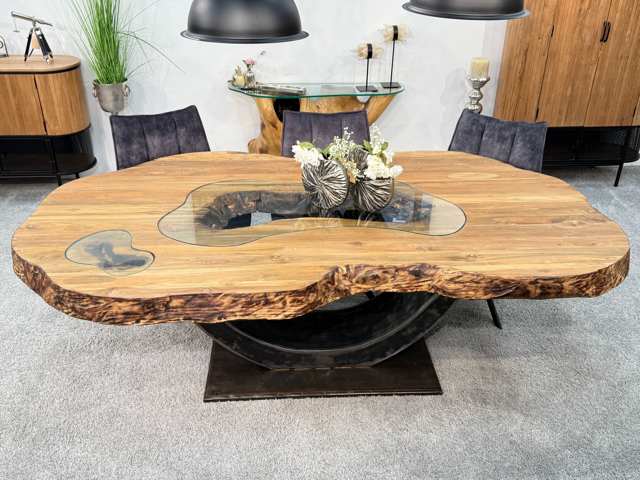 Die ca. 9 cm starke Tischplatte besteht aus verleimten Massivholzbohlen (recyceltes Teakholz), die aus ehemaligen Gebäuden der Inseln Bali und Java stammen. Ein besonderes Highlight sind die eingearbeiteten Glaseinleger, die spannende Einblicke in die massive Struktur des Holzes gewähren und die organische Form unterstreichen. Getragen wird die Platte von einem schweren Halbmond-Gestell aus Rohstahl im angesagten Industriedesign.