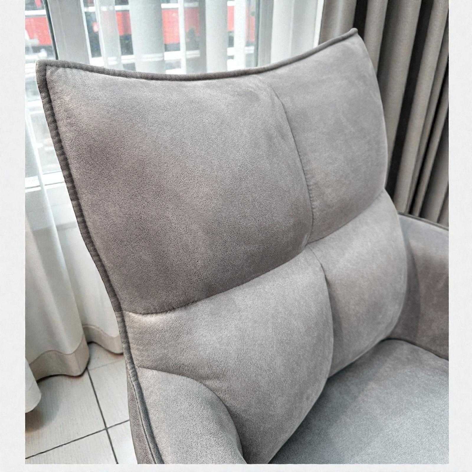 Der hochwertige, grau gesteppte Mikrofaserbezug verleiht dem Stuhl eine elegante Optik und fühlt sich angenehm weich an. Das stabile Eisengestell, schwarz seidenmatt lackiert, sorgt für Standfestigkeit und unterstreicht den modernen Charakter der Serie „Ravenna“.