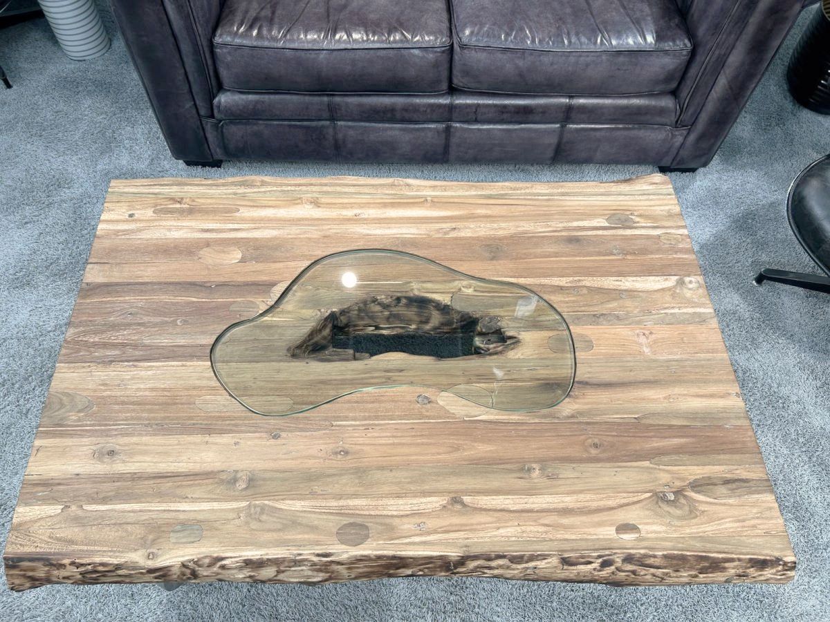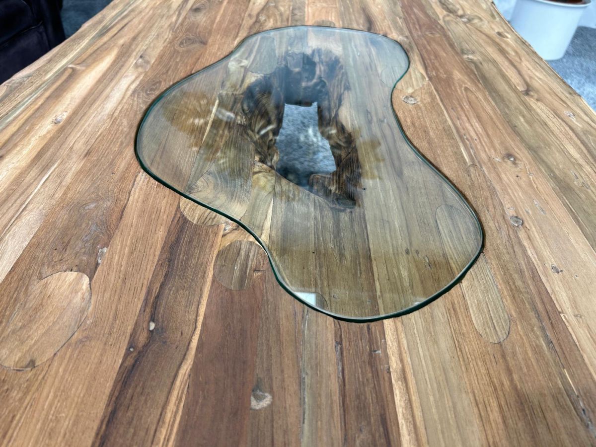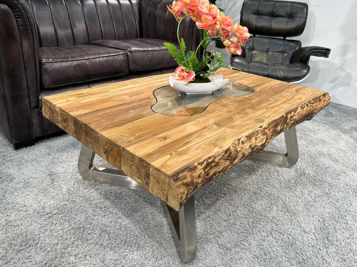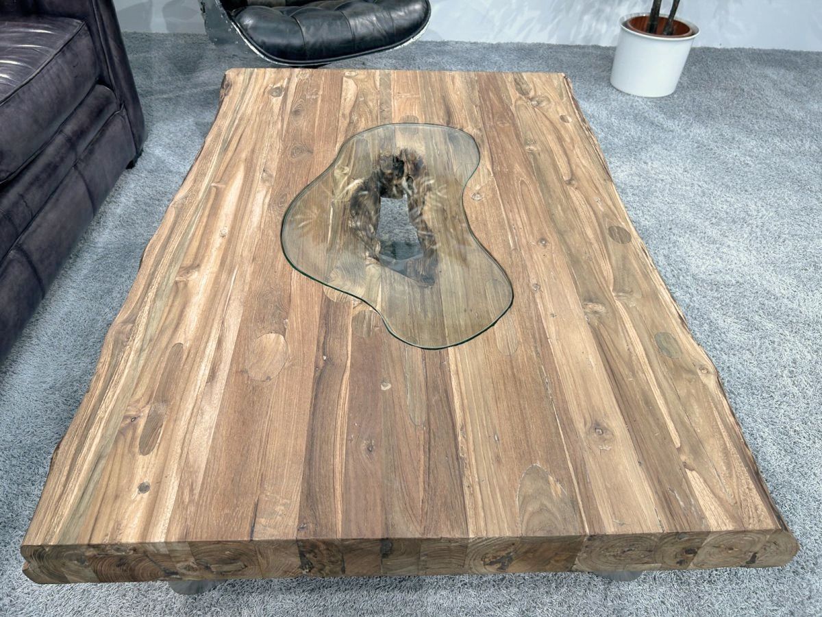 Wohnzimmertisch "Deep Island Freestyle" aus massivem recyceltem Teakholz mit Glas und Edelstahl