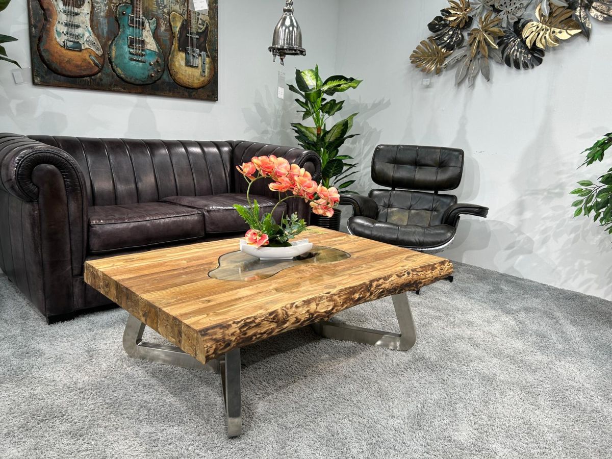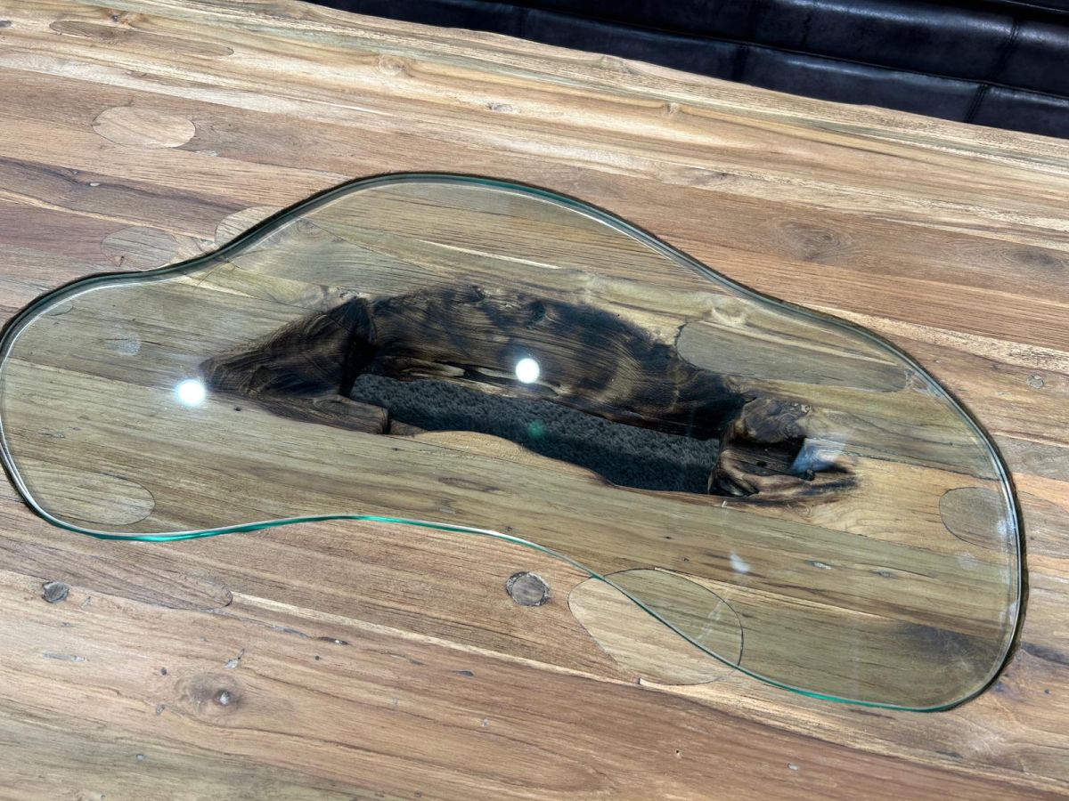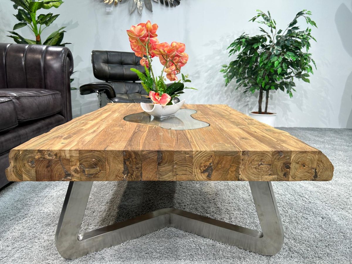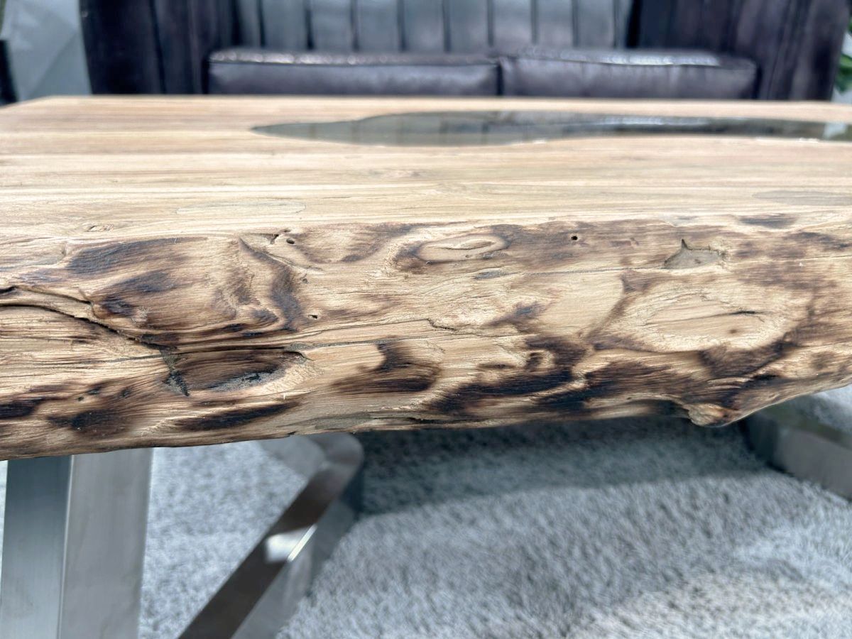 Wohnzimmertisch "Deep Island Freestyle" aus massivem recyceltem Teakholz mit Glas und Edelstahl