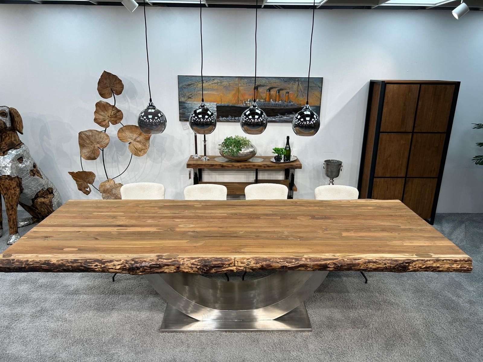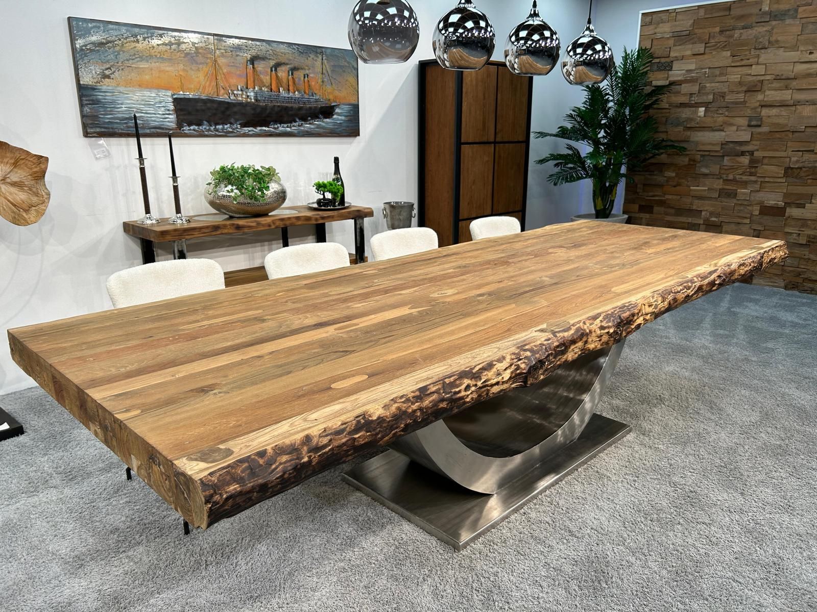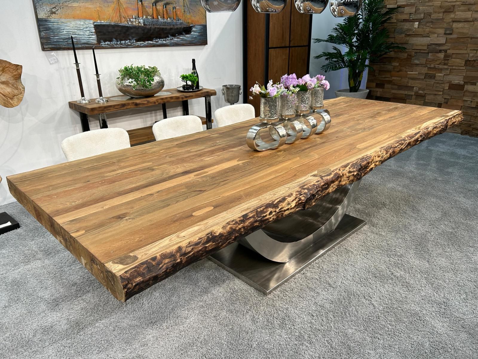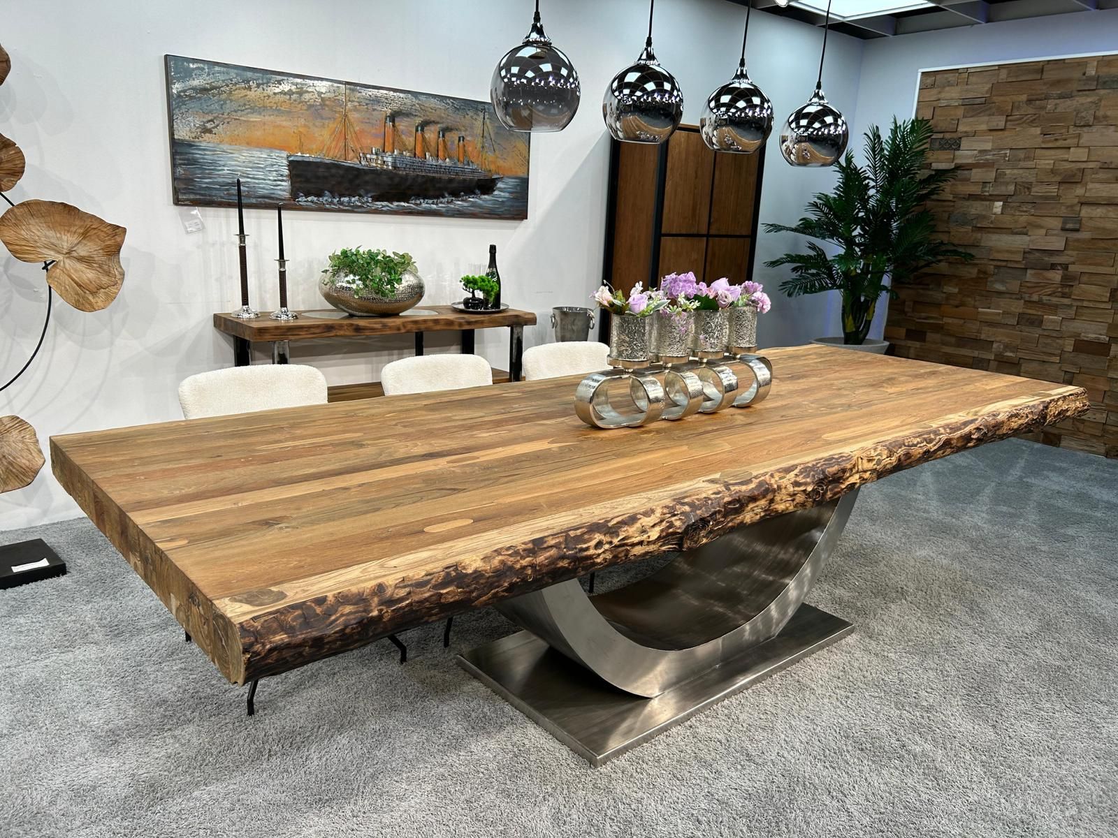 Startseite » Tische auf Wunschmaß » Esstische Wunschmaß » Maßtisch Esstisch "Deep Island" aus Altholz mit Halbmondgestell aus Edelstahl