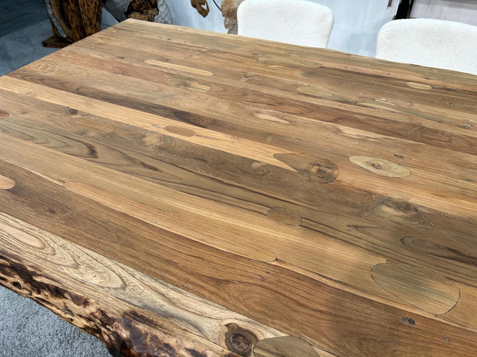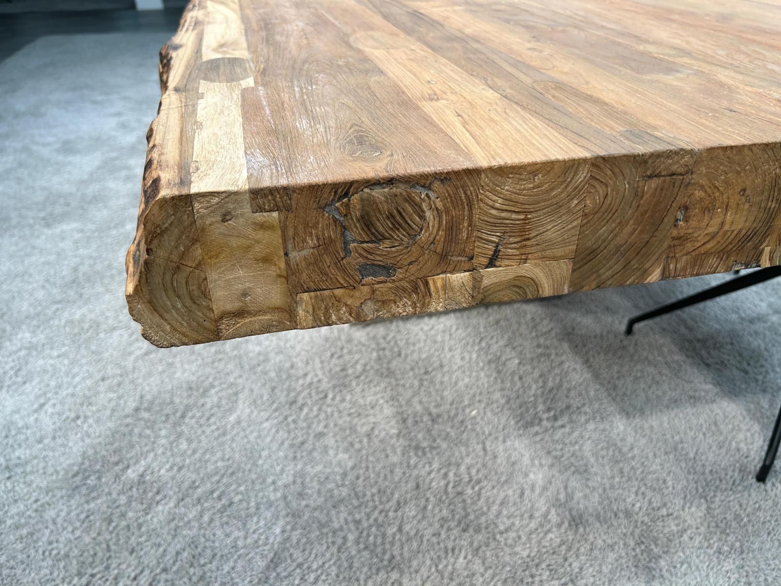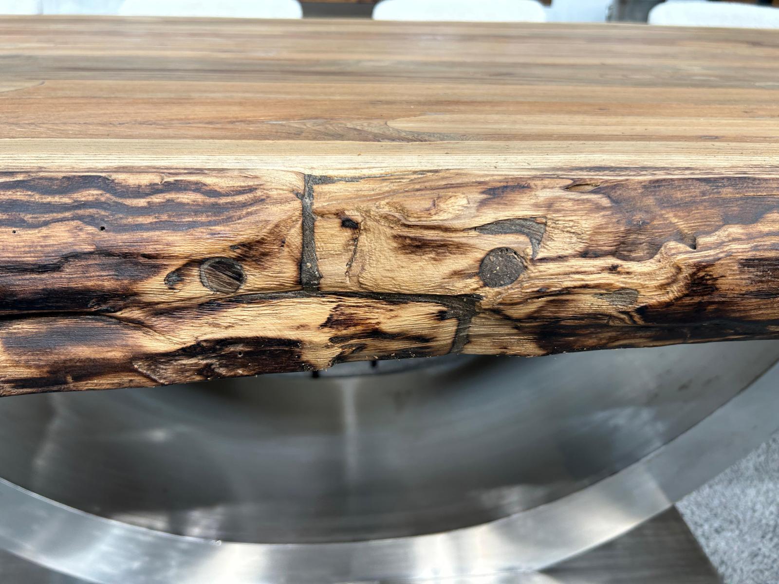 Bei diesem Esstisch aus Altholz bekommt der Begriff "Nachhaltigkeit" eine völlig neue Bedeutung. Die massive Tischplatte besteht aus verleimten Massivholzbohlen mit einer sagenhaften Stärke von 9 bis 10 cm. Die massiven Holzbohlen wurden aufwendig miteinander verleimt und von Hand gebürstet um die wunderschöne Struktur des Holzes hervorzuheben. Die Bearbeitungsspuren der früheren Nutzung der massiven Balken wurden in Kleinarbeit mit Holzdübeln und Holzeinlegern verziert.