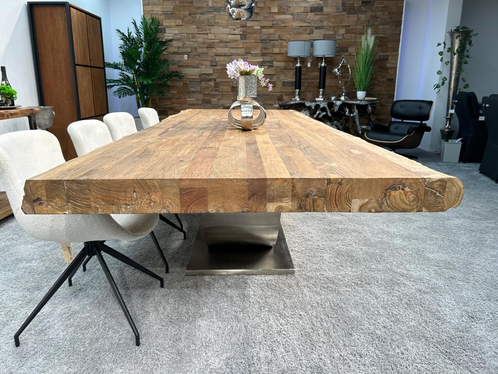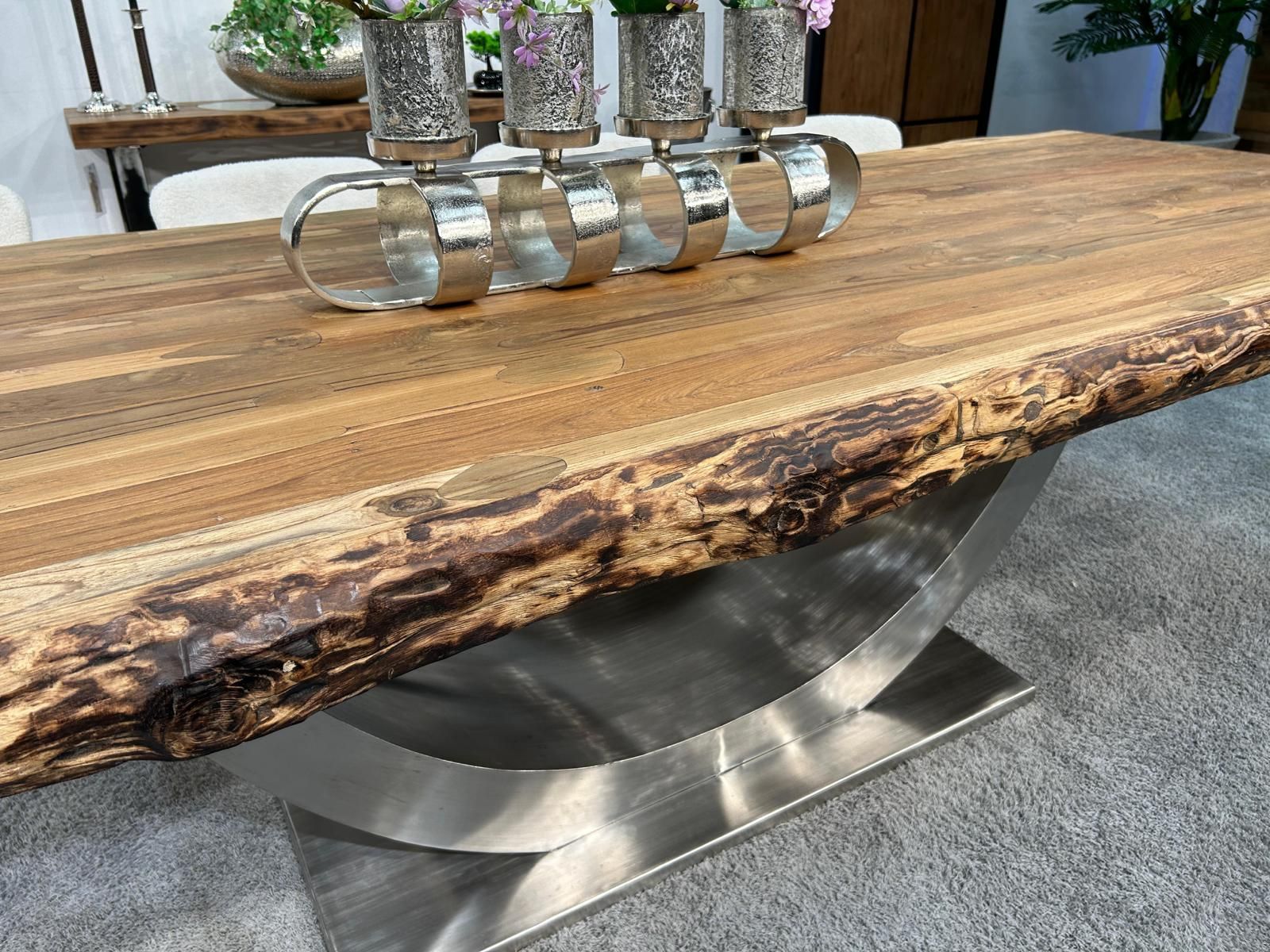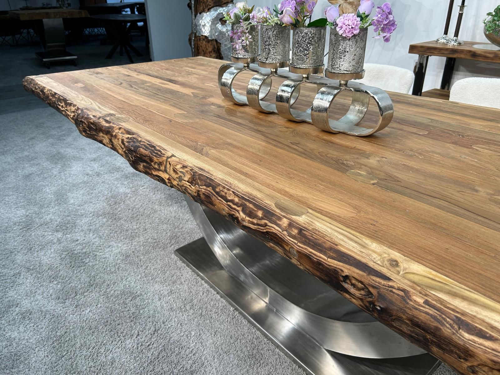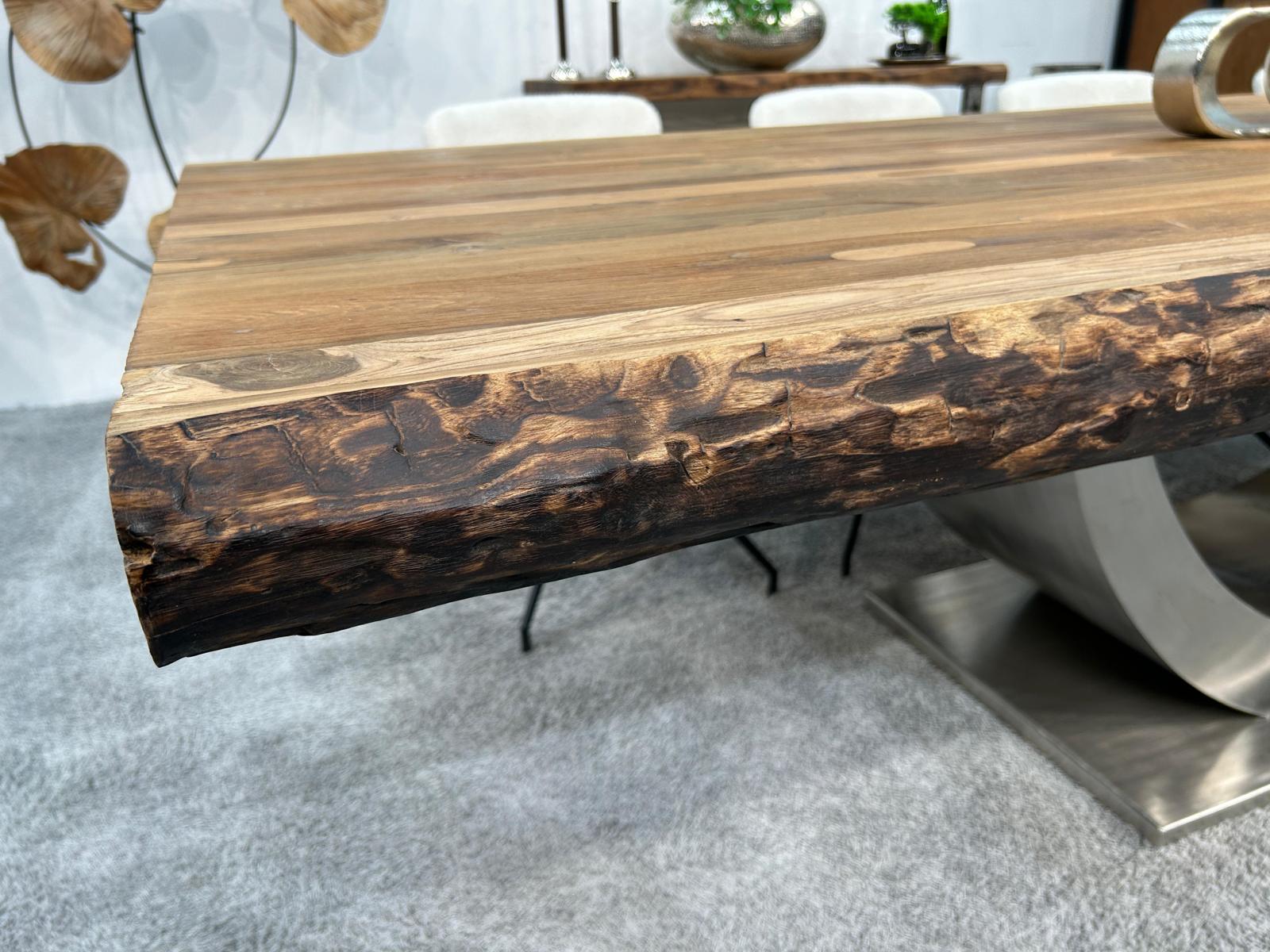 Maßtisch Esstisch "Deep Island" aus Altholz mit Halbmondgestell aus Edelstahl