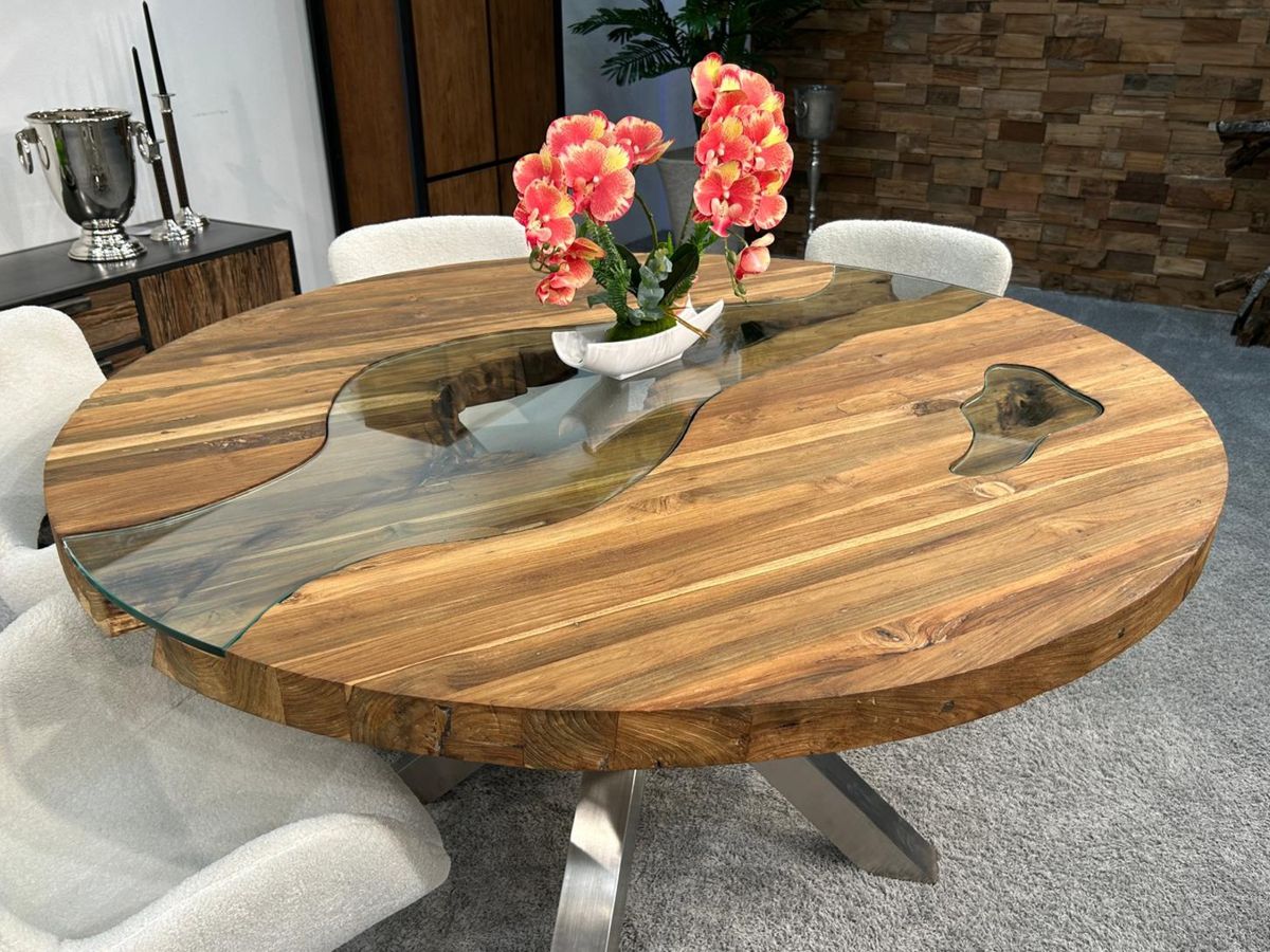 Bei dem Esstisch „Eternia“ handelt es sich um eine interessante Kombination aus den Rohstoffen Altholz, Edelstahl und Glas. Verwendet wurden verleimte Altholzbohlen aus Teak, welche abschließend von Hand gebürstet und gewachst wurden. Durch die Verwendung von Altholz erhält dieser Esstisch seine ganz besondere Optik. Die von Hand zusammengefügte massive Tischplatte liegt auf einem Tischgestell aus Rohstahl in Kreuzform und bietet aufgrund seiner runden Form viel Platz. Das eingefräste Glas hat eine Stärke von 10 mm.