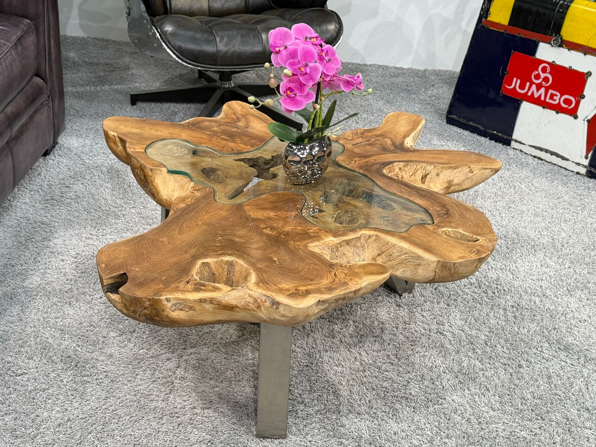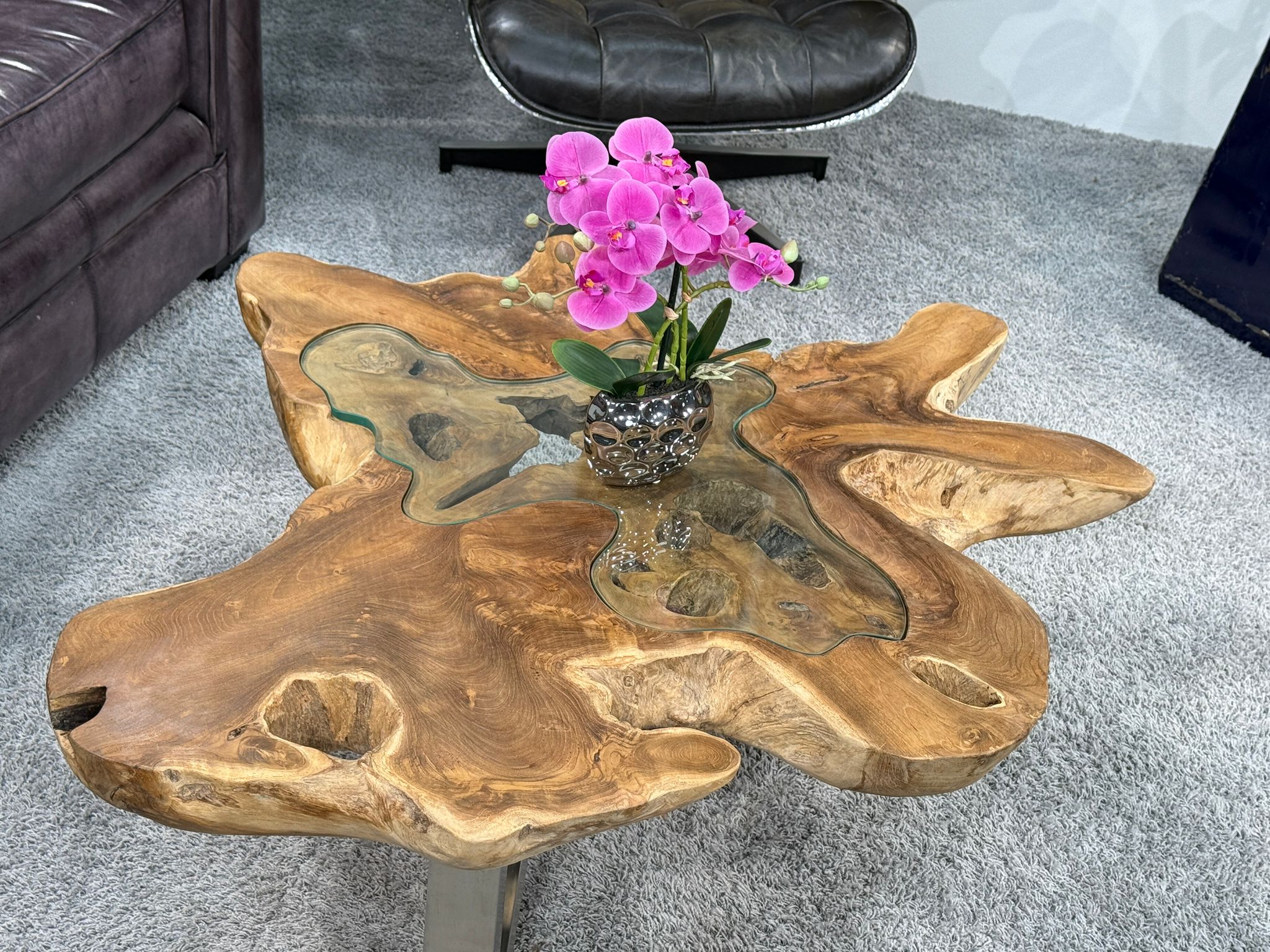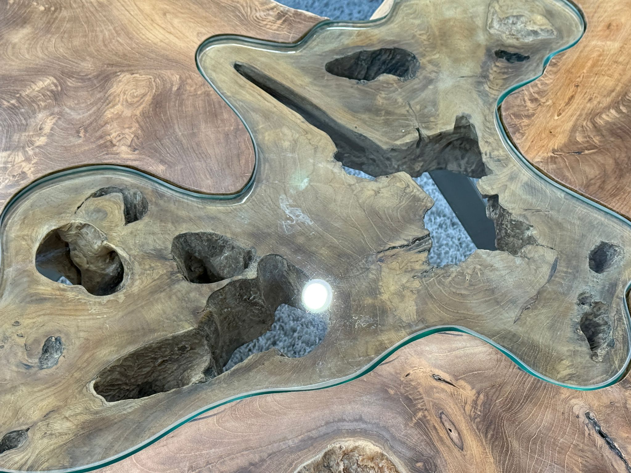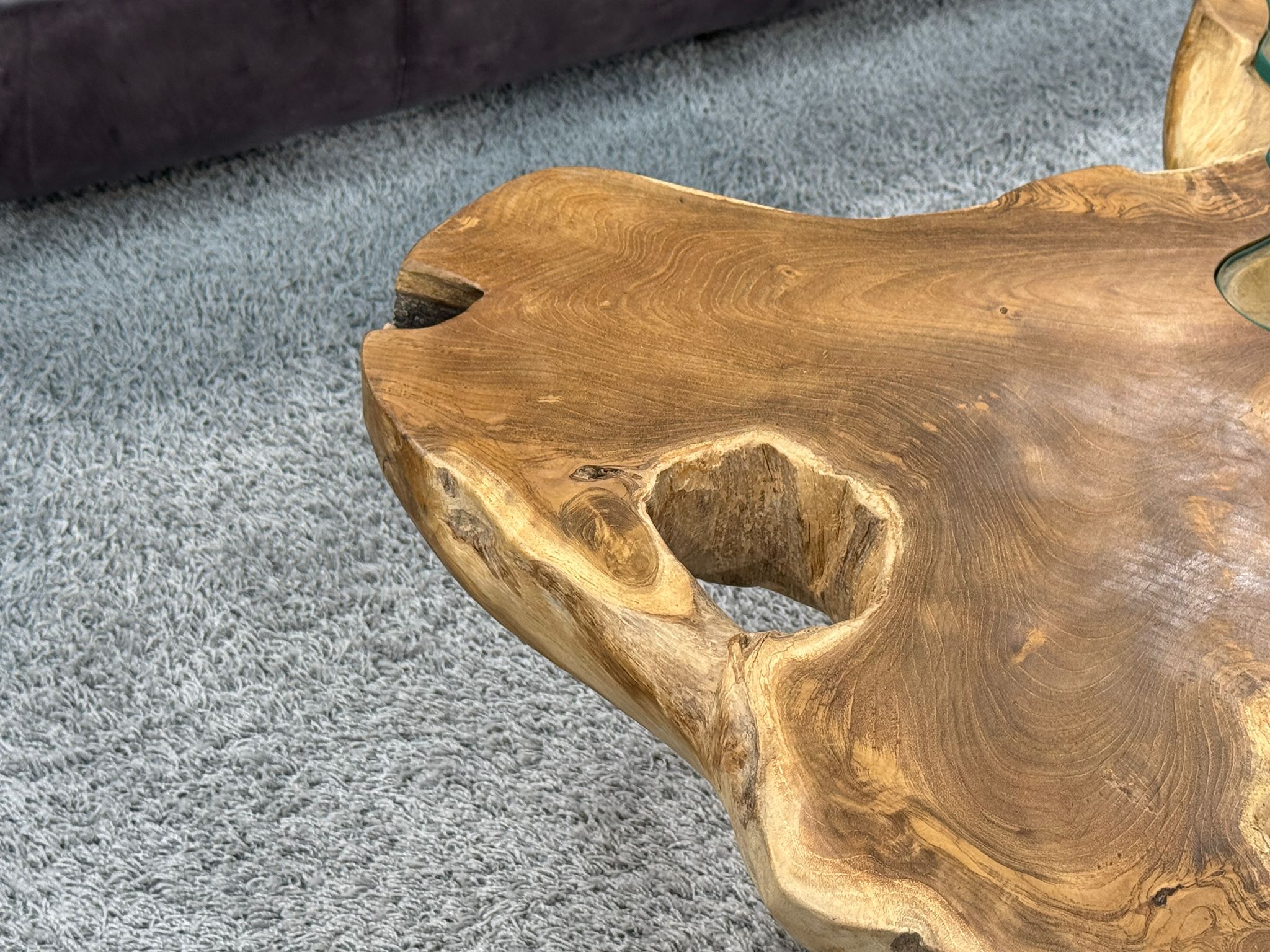 Das Besondere an diesem Unikat ist die massive Plattenstärke von ca. 8 cm. Gefertigt aus einer Baumscheibe (oft aus dem charakterstarken Wurzelbereich des Teakbaumes), wurden natürliche Verwachsungen und Risse nicht kaschiert, sondern mit passgenauen Glaseinlegern veredelt. Dies erzeugt die typische "Lakeside"-Optik, die an kleine Seen in einer Holzlandschaft erinnert. Die Oberfläche ist fein geschliffen und seidenmatt lackiert, was die warme Maserung schützt und hervorhebt.