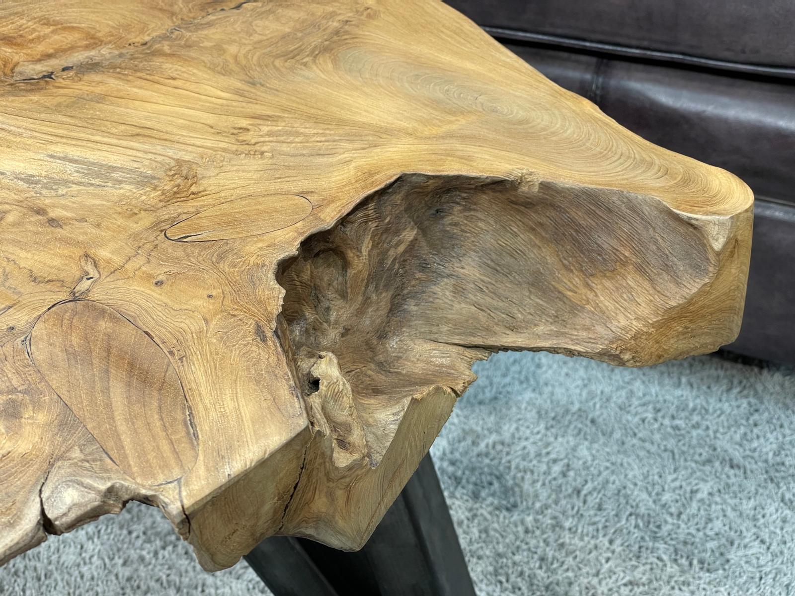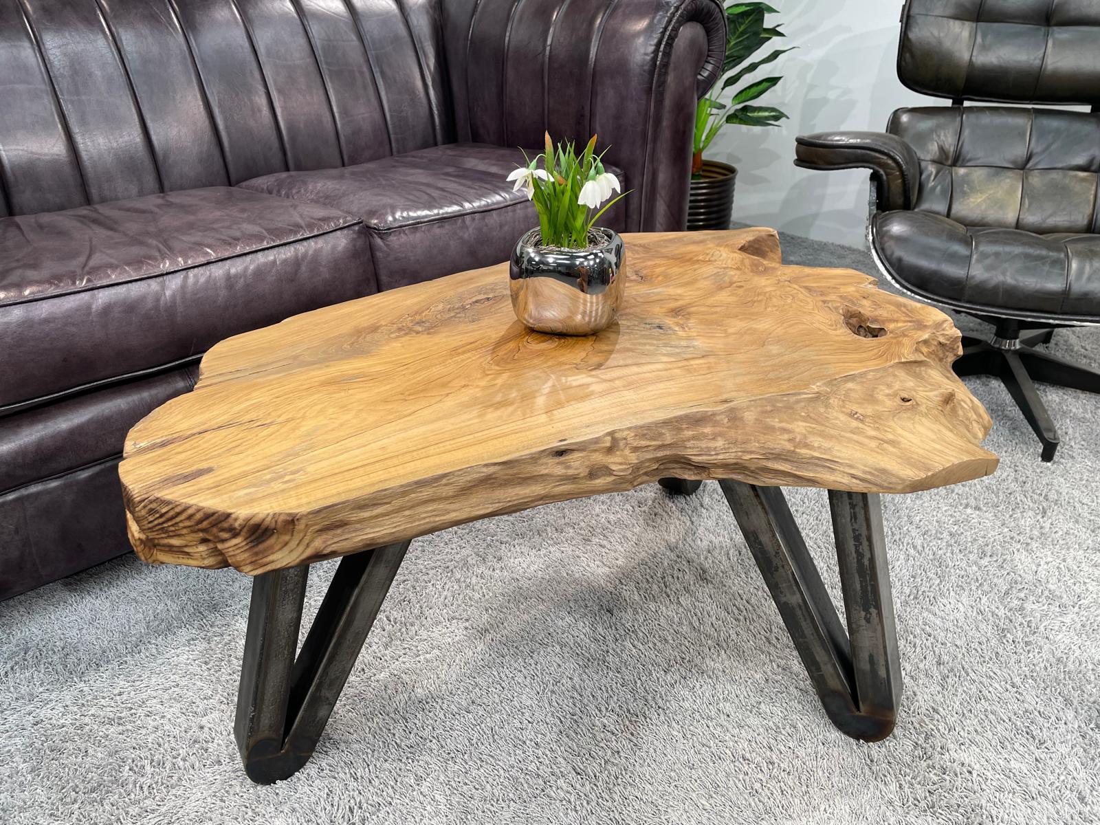 Ein Couchtisch aus einem Baumstamm muss nicht immer eine schlichte, runde Form haben. Das Modell "Bromo" beweist, dass natürliche Unregelmäßigkeiten und charakterstarke Wuchsmerkmale oft viel reizvoller sind als standardisierte Formen.