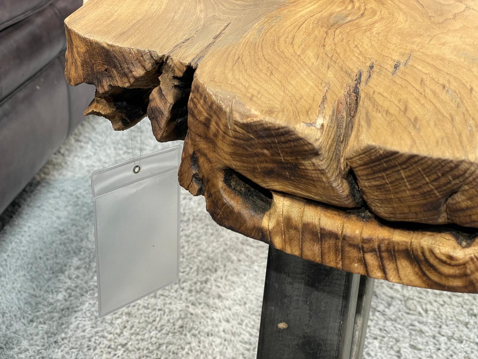 Bei diesem Unikat im Format von ca. 103 x 41–71 cm kommt eine massive Baumscheibe aus Teakholz zum Einsatz. Die natürlich gewachsene Form weist seitliche Verwachsungen und eine lebendige Maserung auf, die Geschichten aus Jahrzehnten erzählen. Besonders interessant ist, wie sich der Baumstamm im Laufe der Zeit geformt hat – fernab von geraden Linien, hin zu einem organischen Kunstwerk der Natur.
