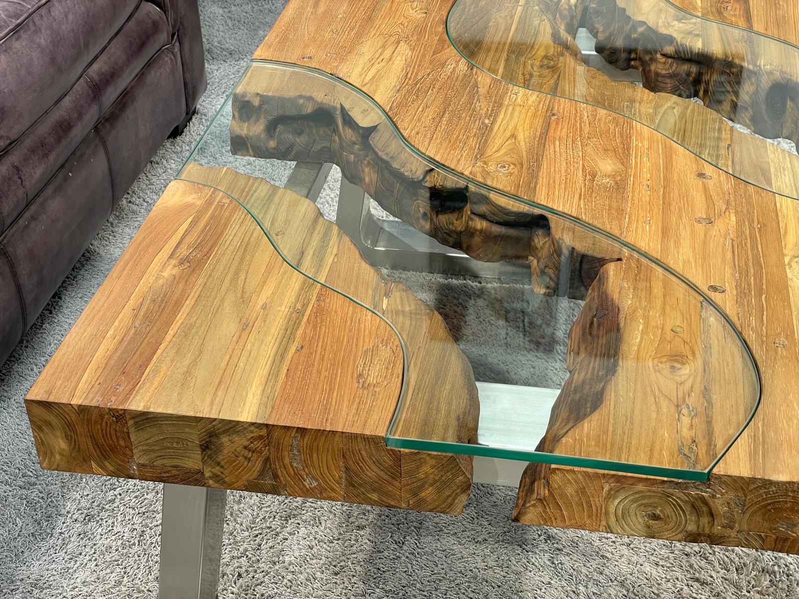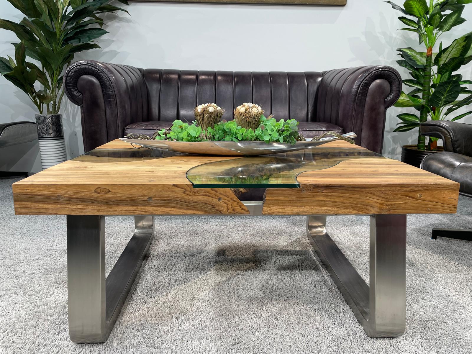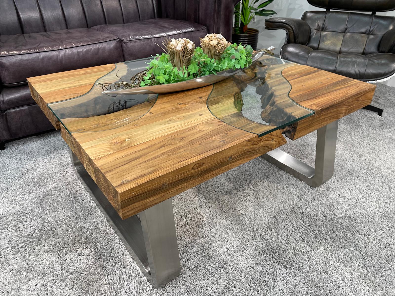 Die Tischplatte besteht aus drei massiven Holzelementen, die aus recyceltem Teakholz gefertigt wurden. Das Holz stammt aus alten Gebäuden auf Java und Bali und zeichnet sich durch seine Stabilität und Langlebigkeit aus. Die Holzelemente haben eine beeindruckende Stärke von 7 cm und sind durch zwei schmale Zwischenräume getrennt. Diese wurden in Handarbeit mit Glaseinlagen ausgestattet, die optisch an Flussläufe erinnern und den Tisch individuell gestalten.
