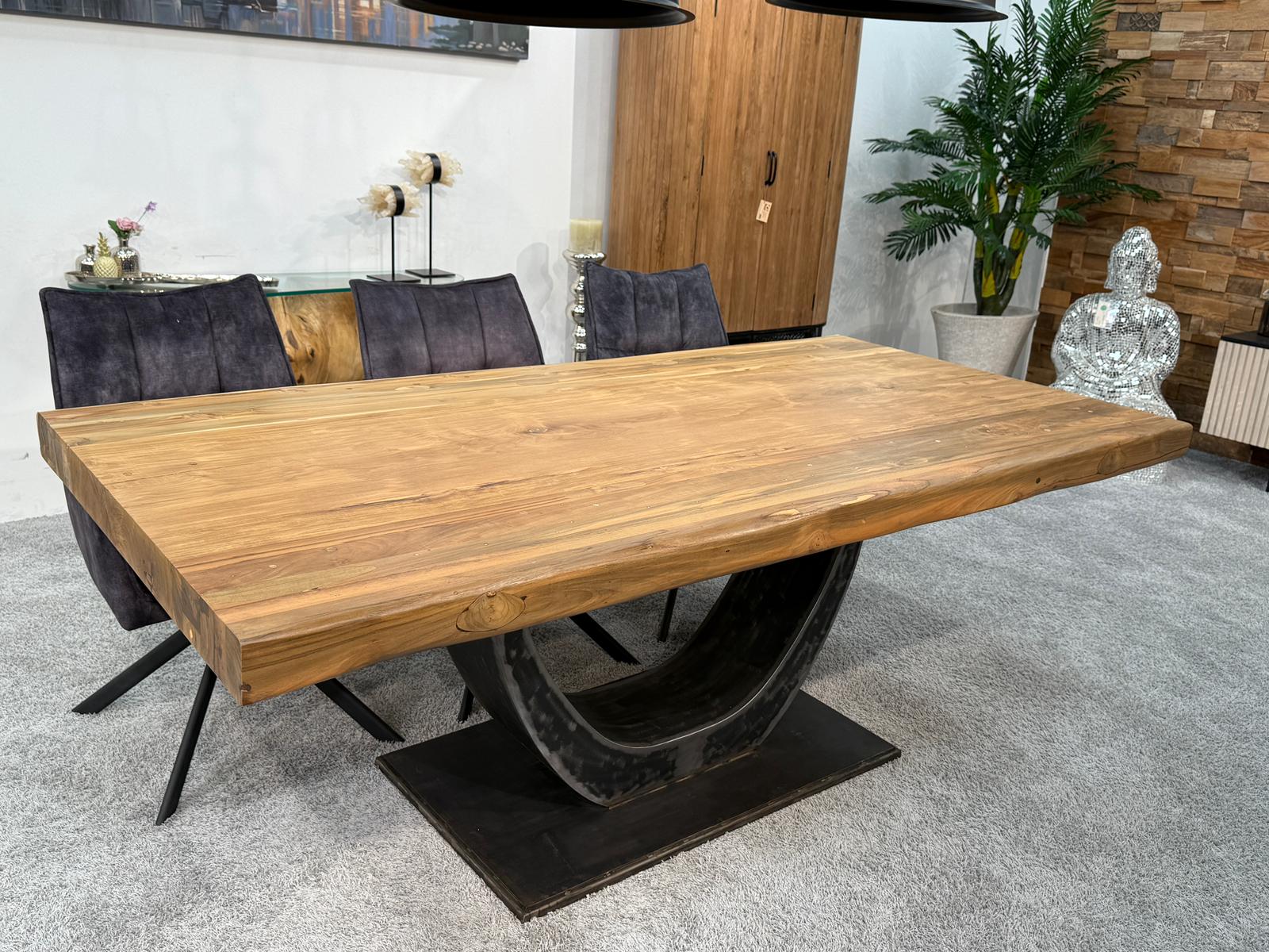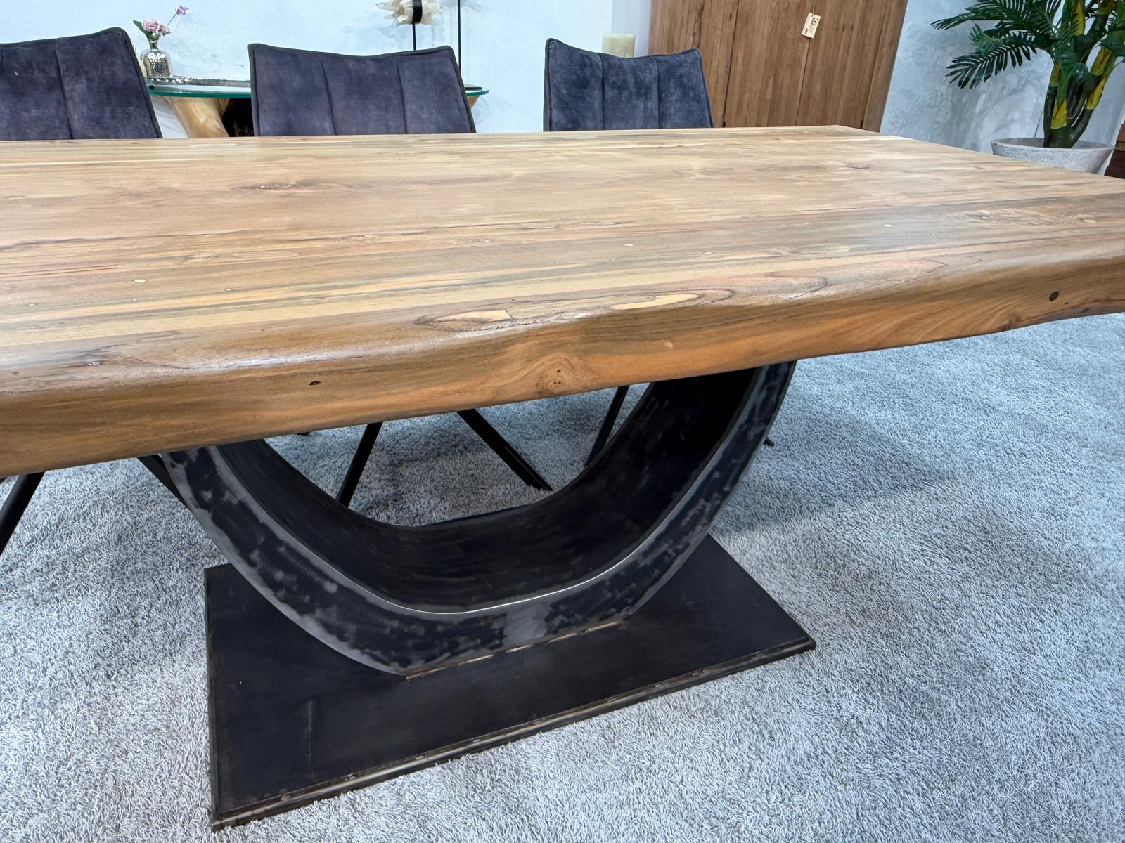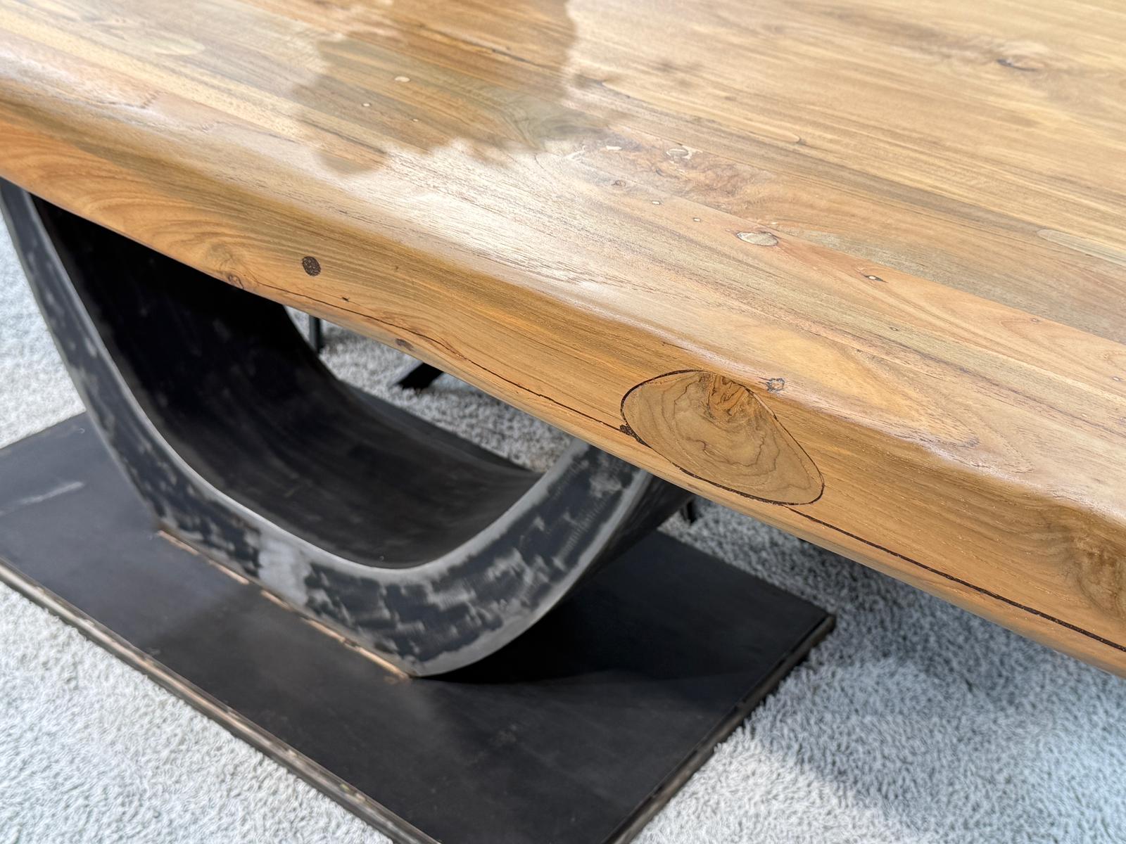 Das Herzstück dieses Tisches ist die imposante, ca. 8 cm starke Tischplatte aus Teakholz. Bei diesem Modell wird bewusst auf Glaseinlagen verzichtet, um die ununterbrochene, durchgehende Holzstruktur und die warme Haptik des Materials in den Vordergrund zu stellen. Getragen wird die massive Holzplatte von einem ausdrucksstarken Halbmondgestell aus Rohstahl. Dieses handgefertigte Gestell verleiht dem Tisch einen markanten Industrie-Look und sorgt gleichzeitig für maximale Beinfreiheit an allen Sitzplätzen.