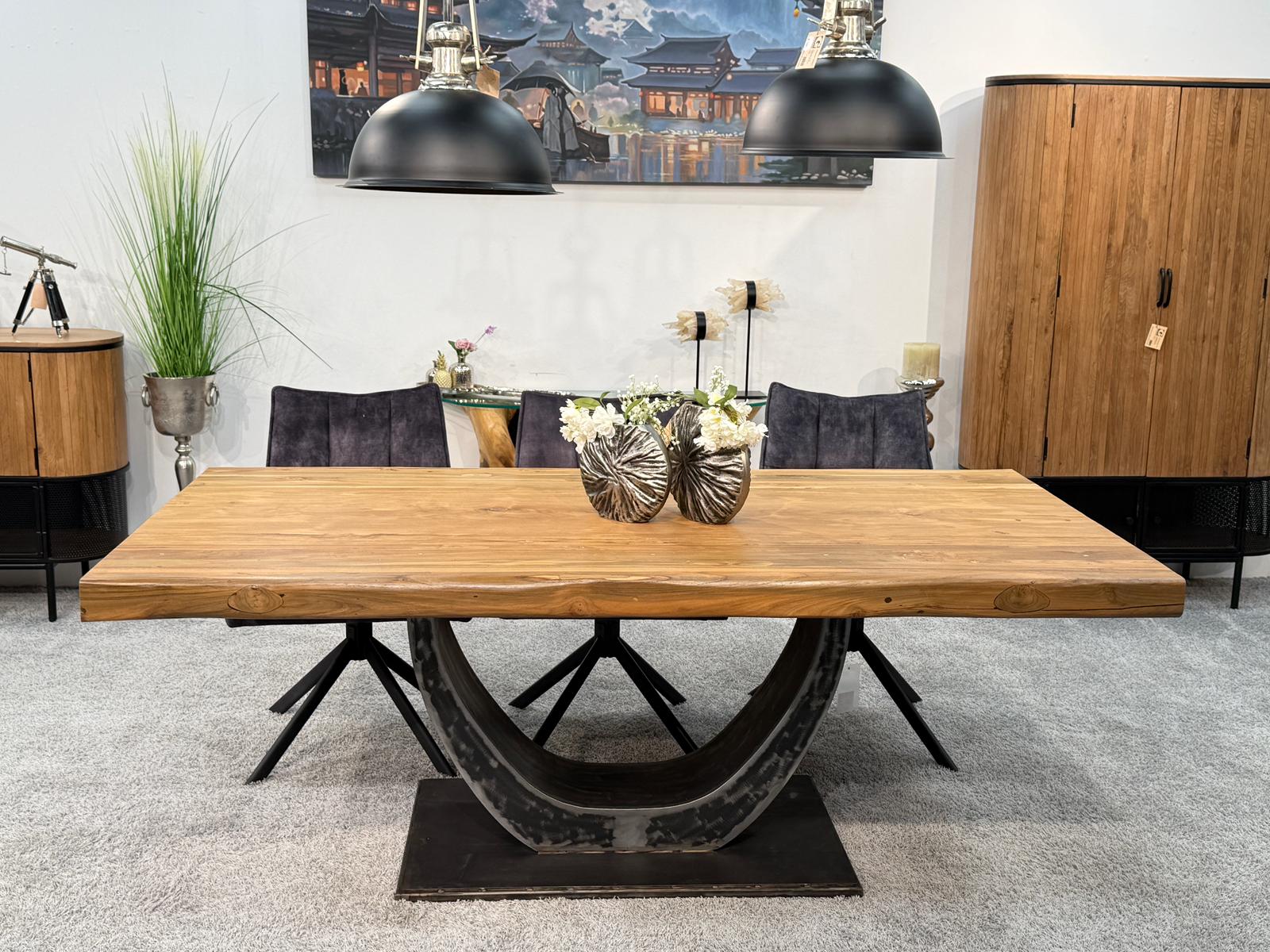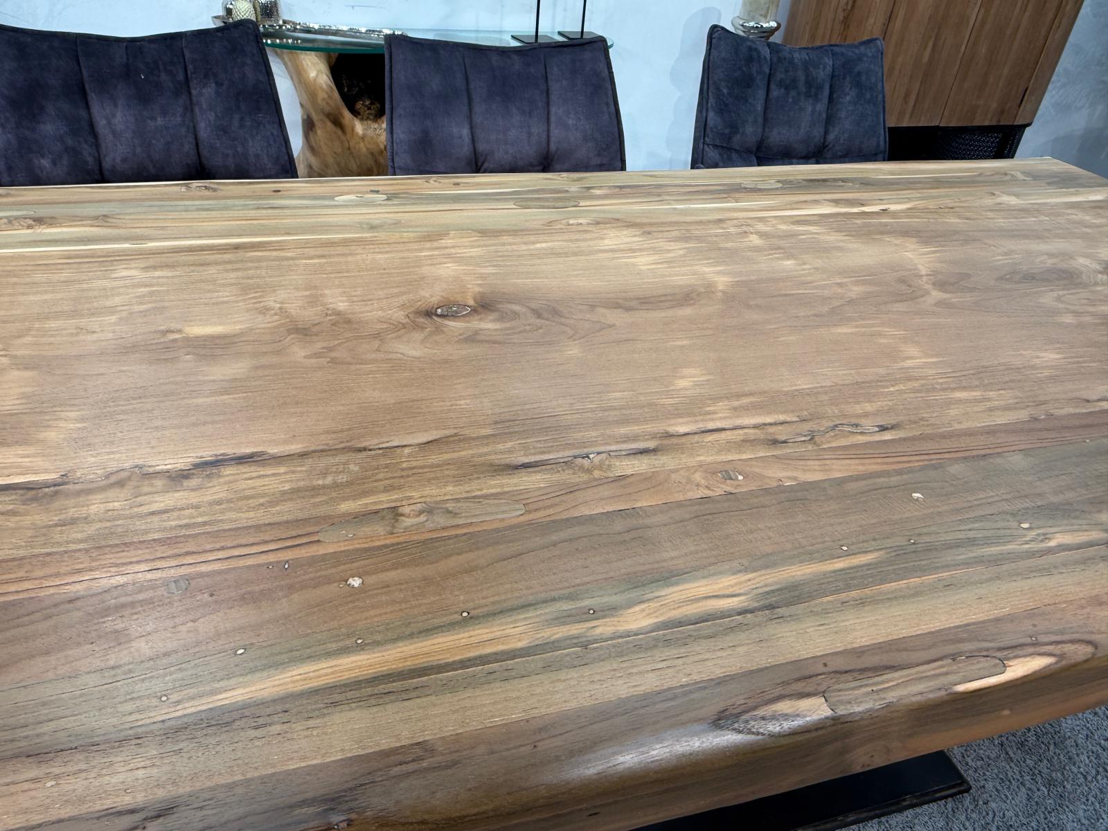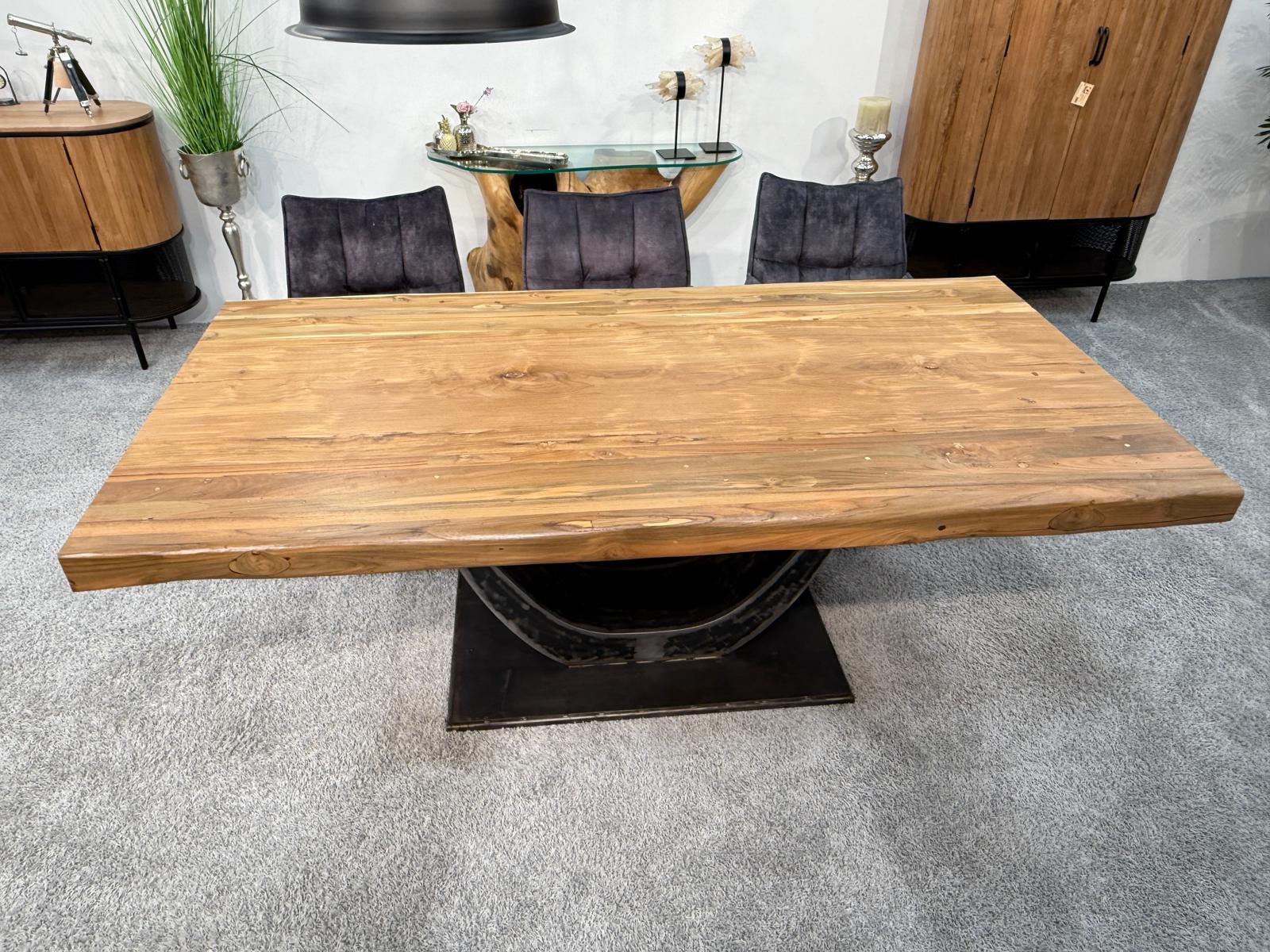 Das Herzstück dieses Tisches ist die imposante, ca. 8 cm starke Tischplatte aus Teakholz. Bei diesem Modell wird bewusst auf Glaseinlagen verzichtet, um die ununterbrochene, durchgehende Holzstruktur und die warme Haptik des Materials in den Vordergrund zu stellen. Getragen wird die massive Holzplatte von einem ausdrucksstarken Halbmondgestell aus Rohstahl. Dieses handgefertigte Gestell verleiht dem Tisch einen markanten Industrie-Look und sorgt gleichzeitig für maximale Beinfreiheit an allen Sitzplätzen.