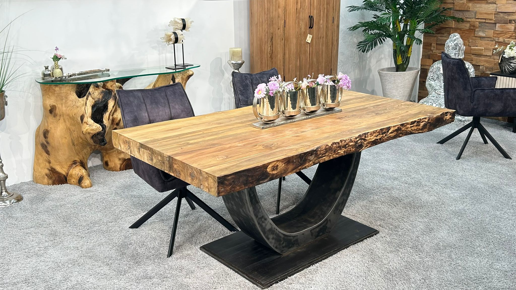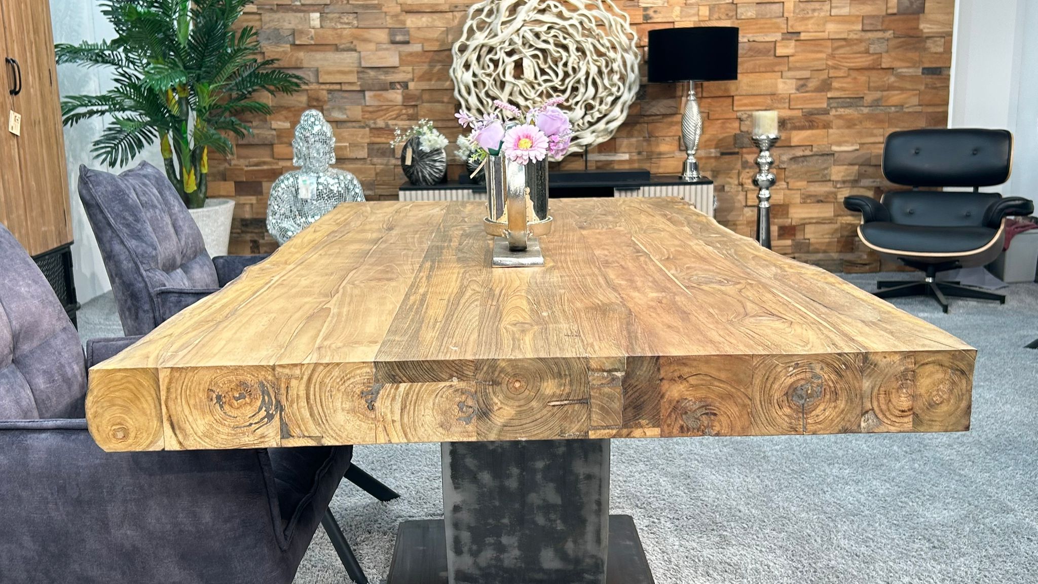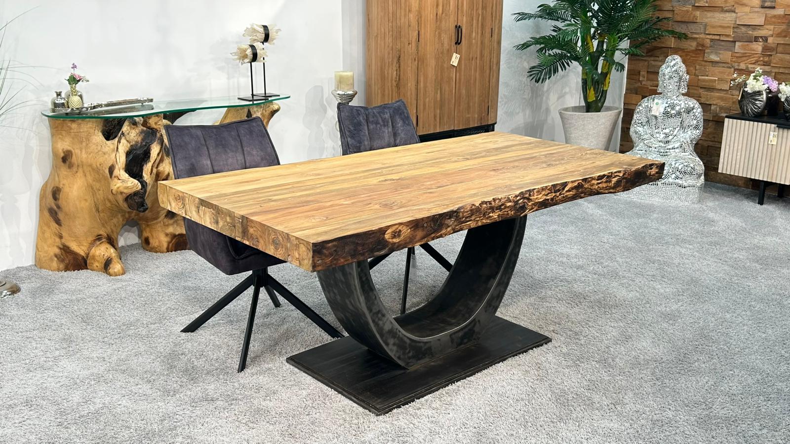 Die beeindruckende, ca. 10 cm starke Tischplatte aus recyceltem Teakholz verleiht dem Tisch eine enorme Stabilität und macht ihn zu einem echten Schwergewicht. Dieses nachhaltige Material sorgt nicht nur für Langlebigkeit, sondern zeichnet sich auch durch eine markante Holzmaserung aus. Getragen wird die Platte von einem Tischfuß in Halbmondform im Industriedesign, der die moderne Ästhetik unterstreicht.