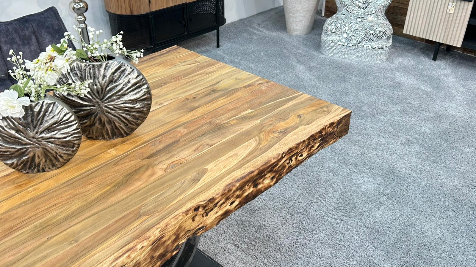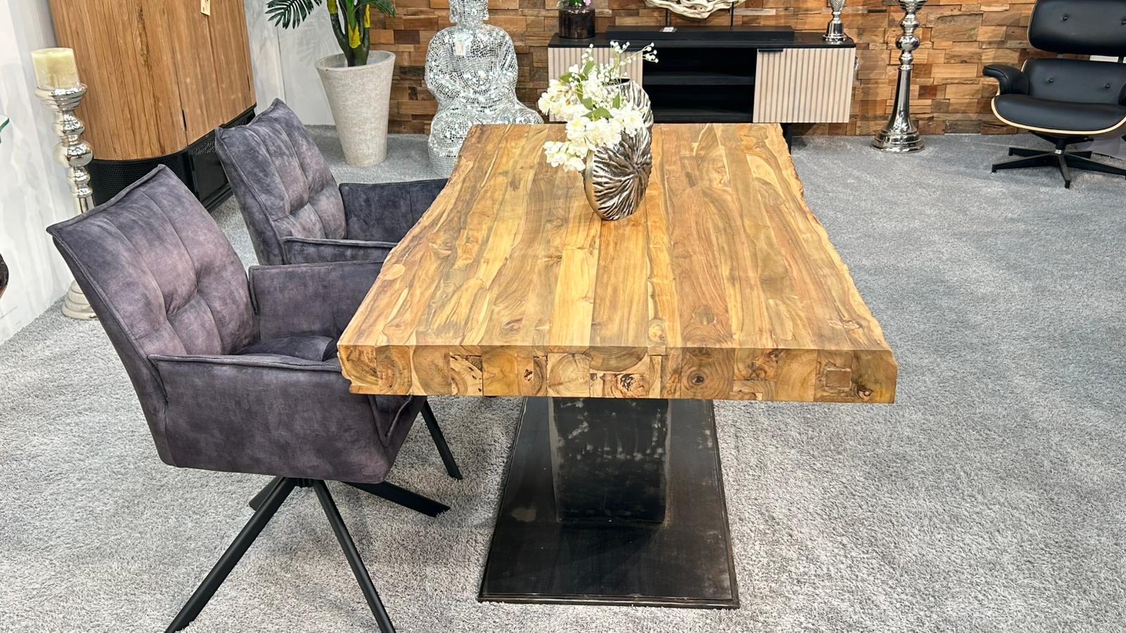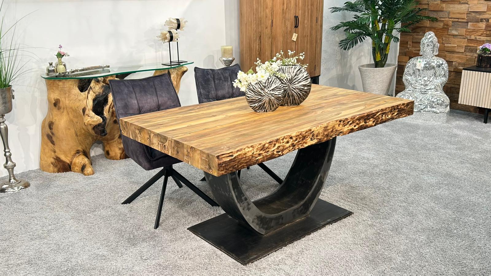 Die beeindruckende, ca. 10 cm starke Tischplatte aus recyceltem Teakholz verleiht dem Tisch eine enorme Stabilität und macht ihn zu einem echten Schwergewicht. Dieses nachhaltige Material sorgt nicht nur für Langlebigkeit, sondern zeichnet sich auch durch eine markante Holzmaserung aus. Getragen wird die Platte von einem Tischfuß in Halbmondform im Industriedesign, der die moderne Ästhetik unterstreicht.